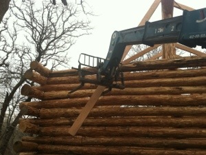 Not much better, huh? Where’s the log? Where’s the Ridge pole? That top log you see is the top log of our wall. Where is Steve? Where’s the pyramid? I’m literally bind, can’t hear, and am operating an enormously powerful machine, lowering, moving, raising, and tiling a log that weighs 3000 pounds or more, suspended by a strap, hovering over my husband and neighbor. If I knock the machine or log into the Ridge pole, will I knock it down? Will I accidentally shake the RPSL out of its strap? The pressure was on…and just kept going.
