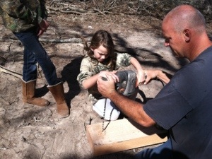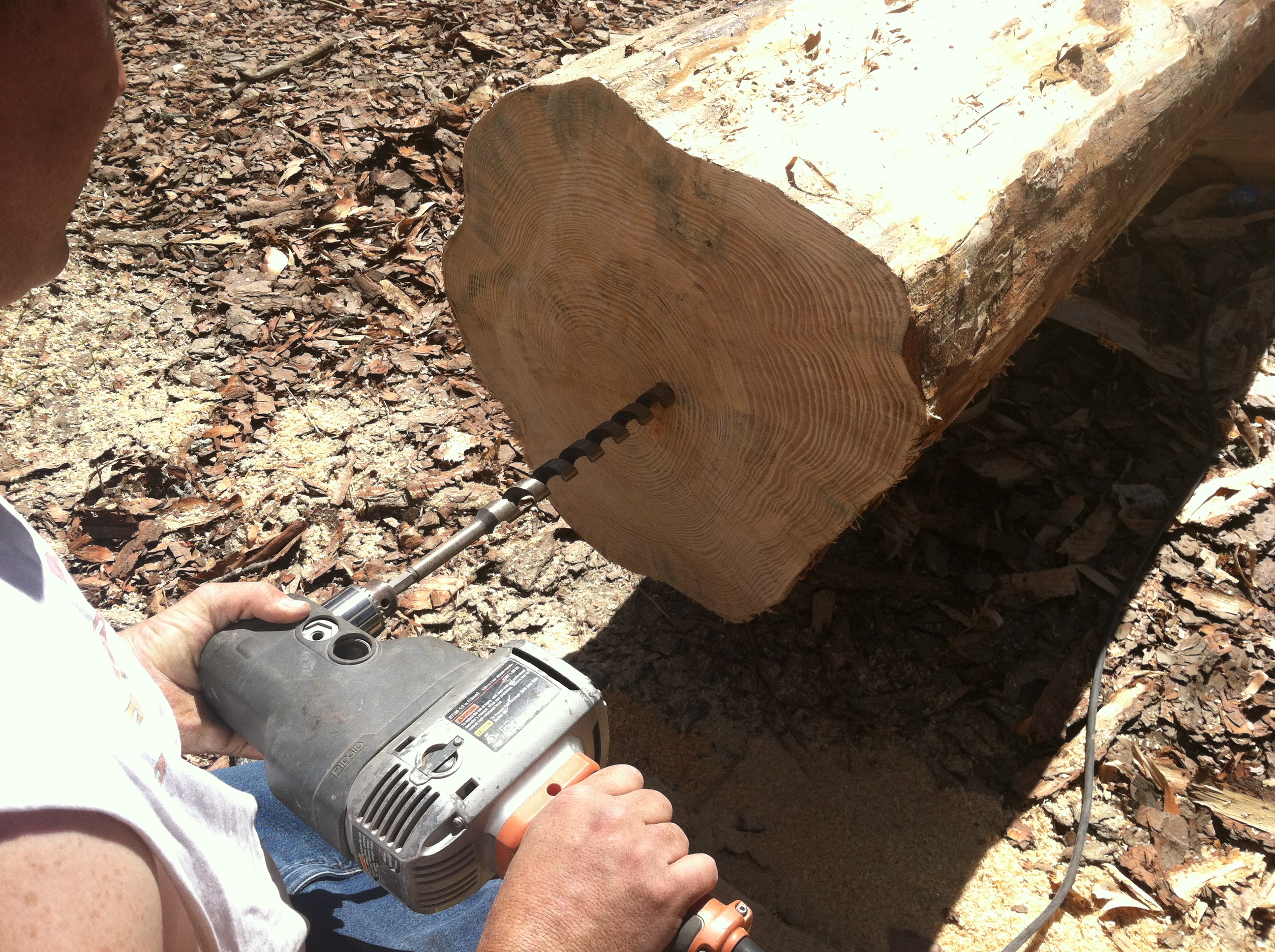 It was ANYTHING but easy. It started out with drilling a hole in the bottom of the log, just like we did in the other vertical logs. The concrete pyramid that we poured Friday had rebar sticking out of it, just like the other concrete pyramids.