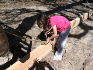 Here are pics of Tool Girl eager to help Daddy, if tools are involved. They’re putting together 2 ends of 2 4×10’s…drilling a hole through both, sliding an althread through both, connecting them, bolting both ends, and prepping the joined rafter to be placed onto the Ridge at that joint they just made: