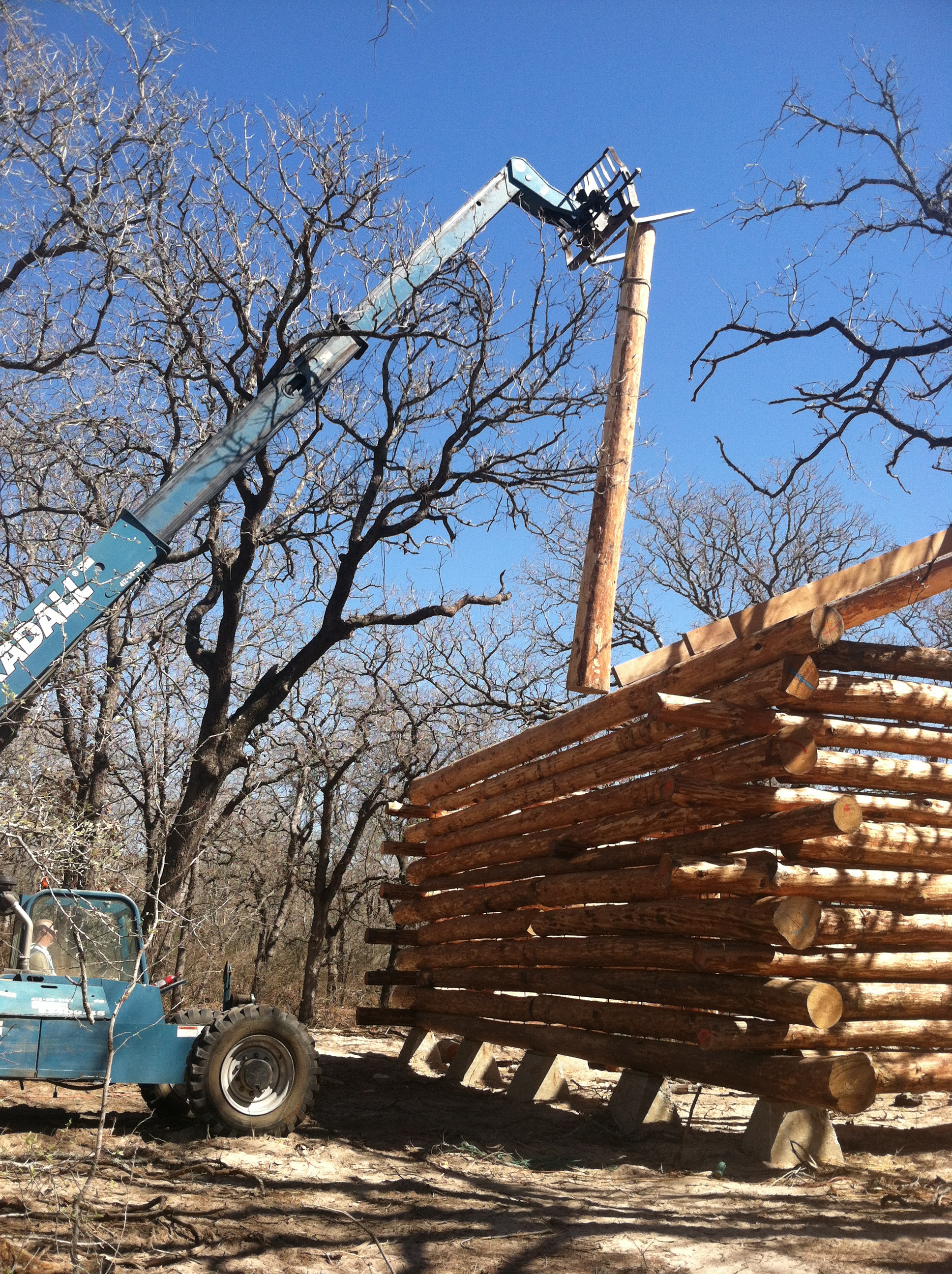While we were in the midst of it all, Dixie and Sue came to visit. Can you see Dixie laying down under the wall, and Sue standing (in black pants to the left, behind the 1st pyramid), trying to peak through the logs? It was great timing, actually. Dixie helped pass along Steve’s telehandler commands to me.