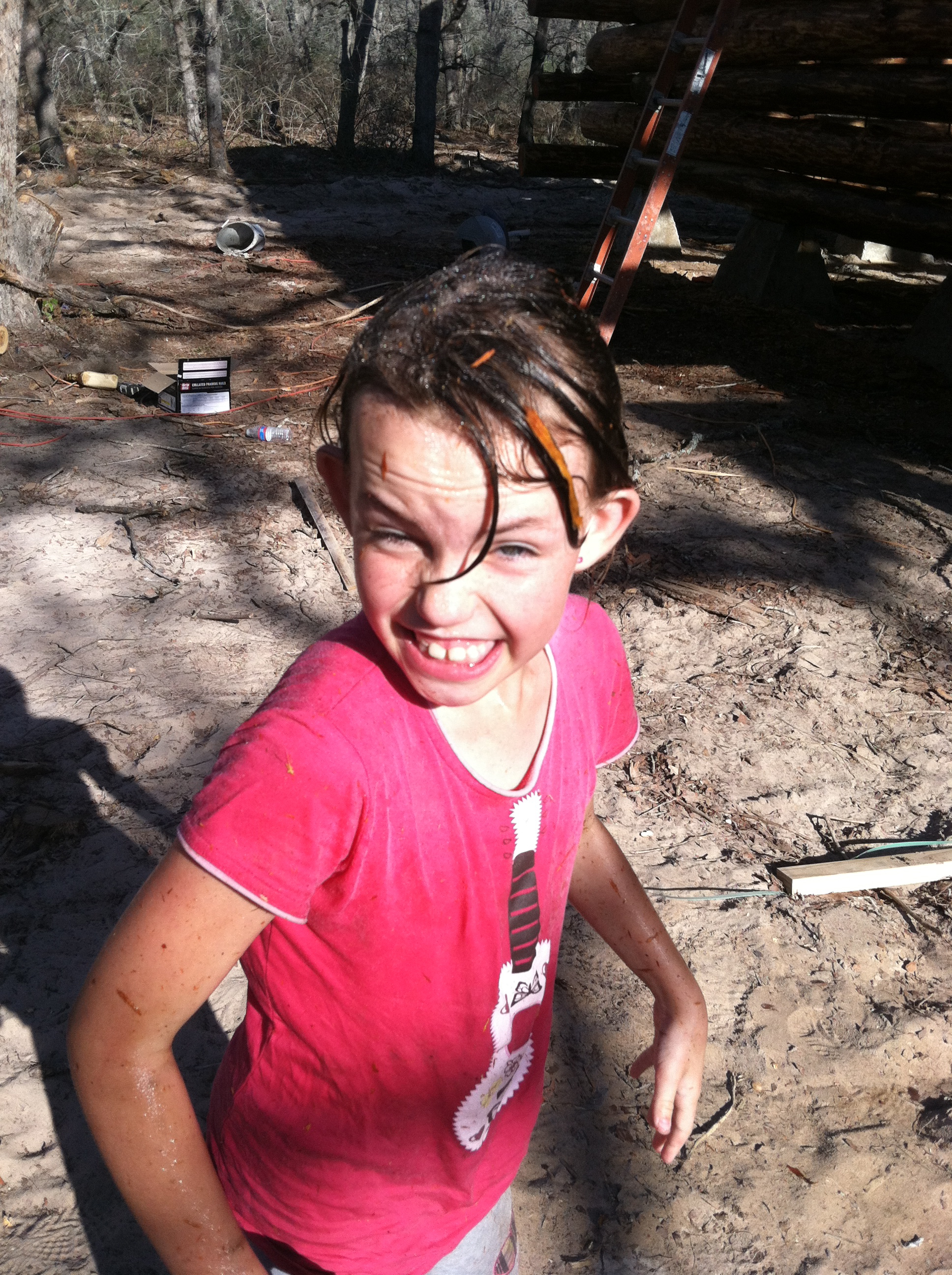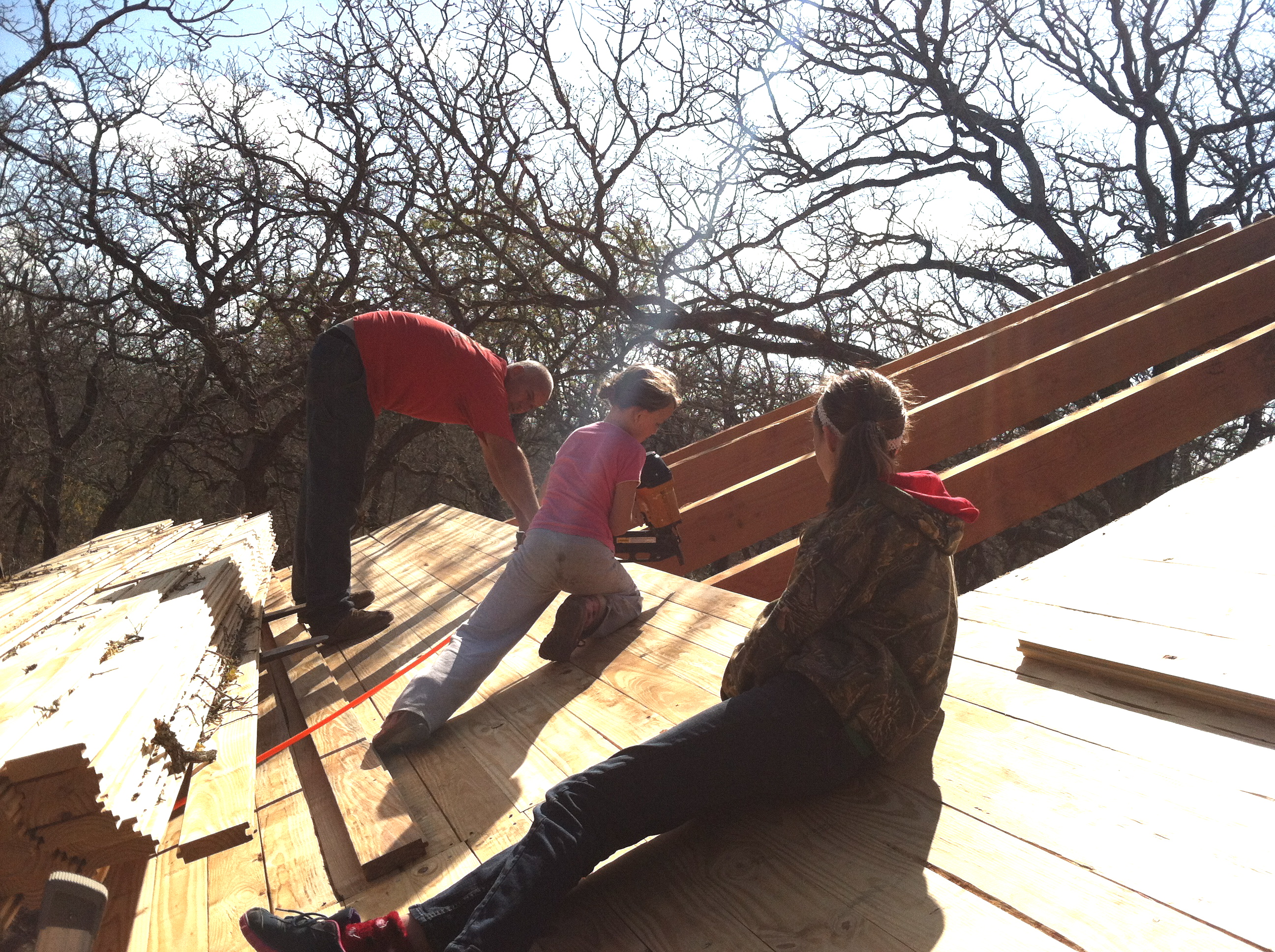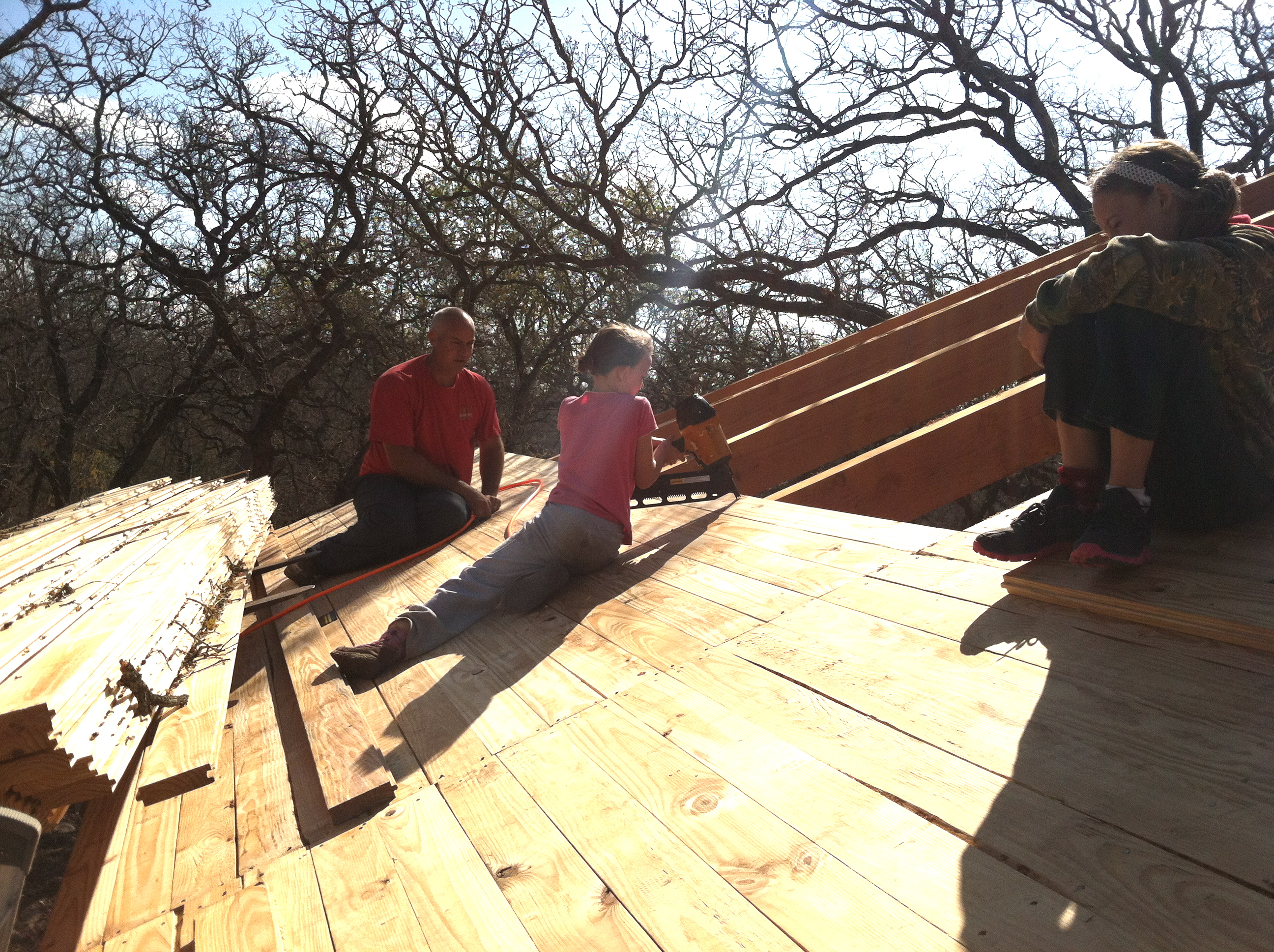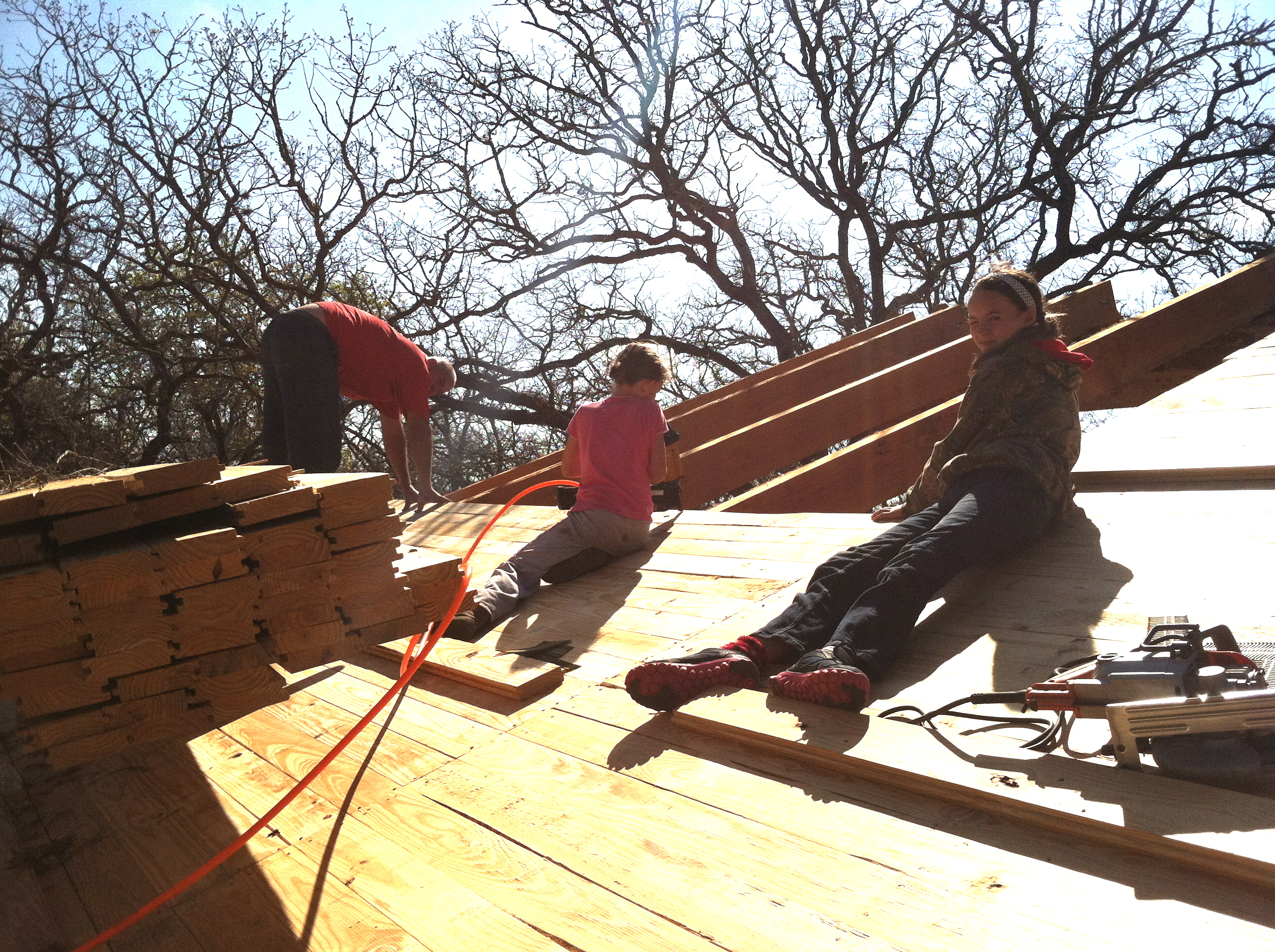 “Girls rule….and guys think that, too,” said my 9-year old, Reese (Tool Girl), this morning, as she man-handled her daddy’s heavy nail gun, easily shooting nails through the decking boards on the roof. (She had a point!) She was so proud of herself using the nail gun, while balancing herself on the sloped roof (while her sister pretty much clung on and stayed in one place), hopping from one spot to the next…wherever a nail was needed. She was truly Daddy’s helper today….and loved every second of it.