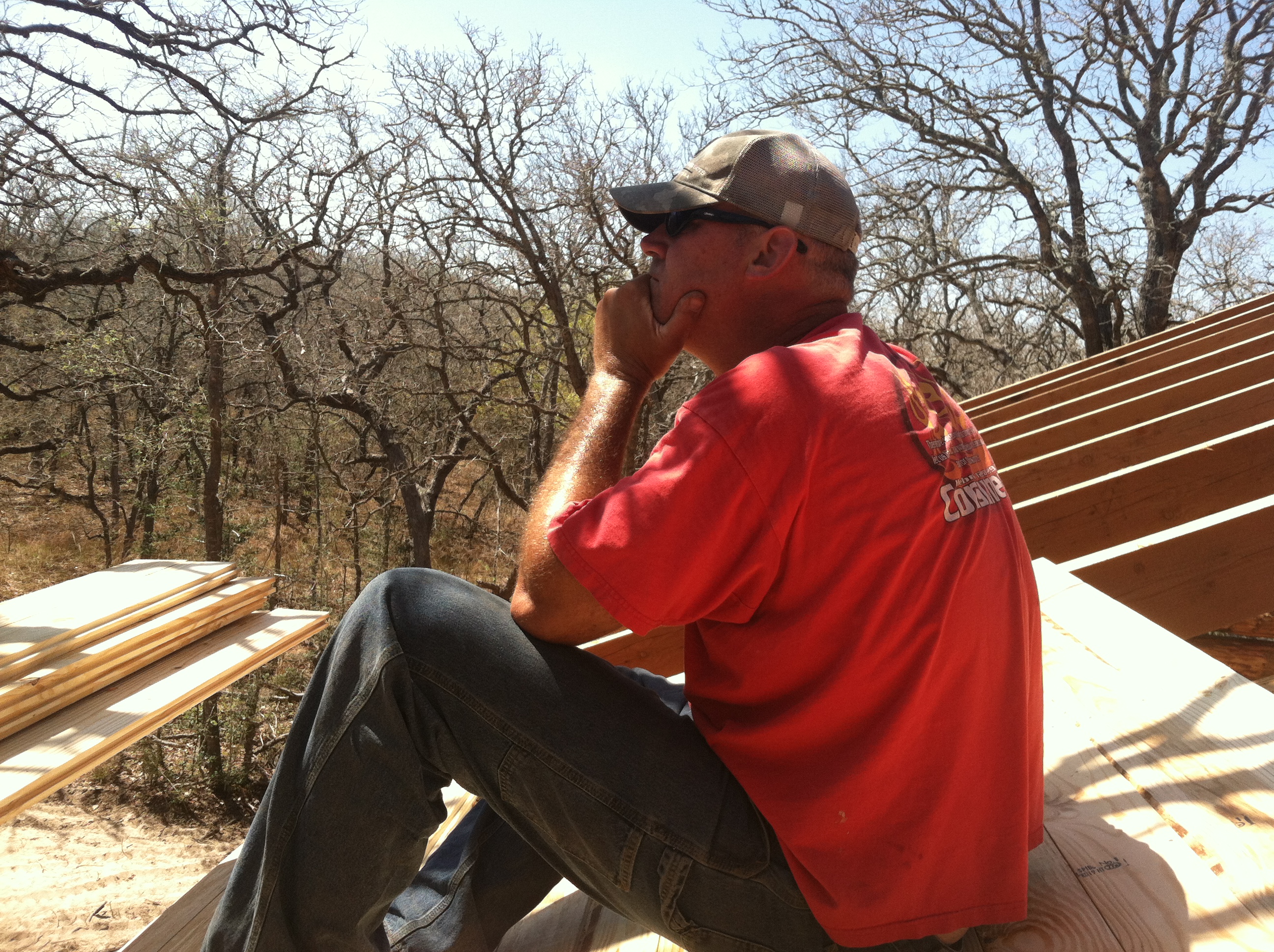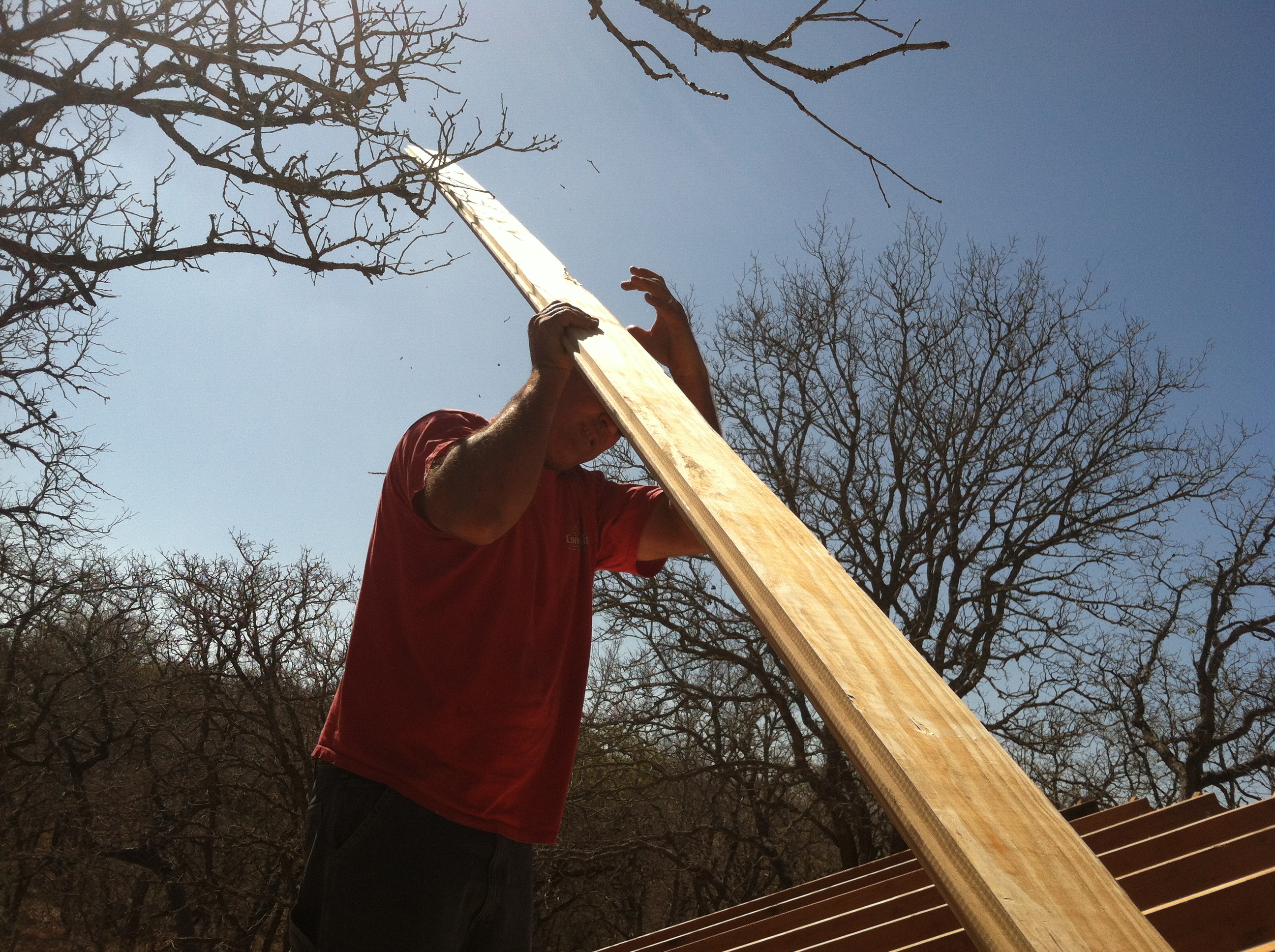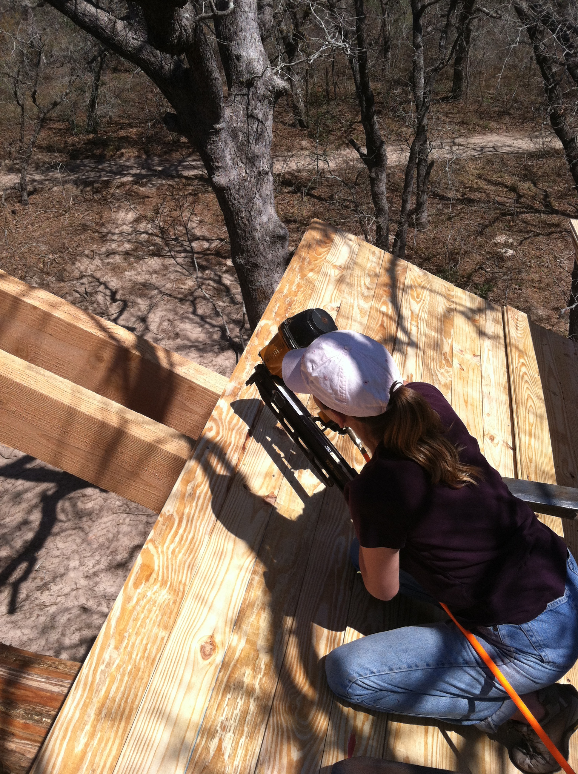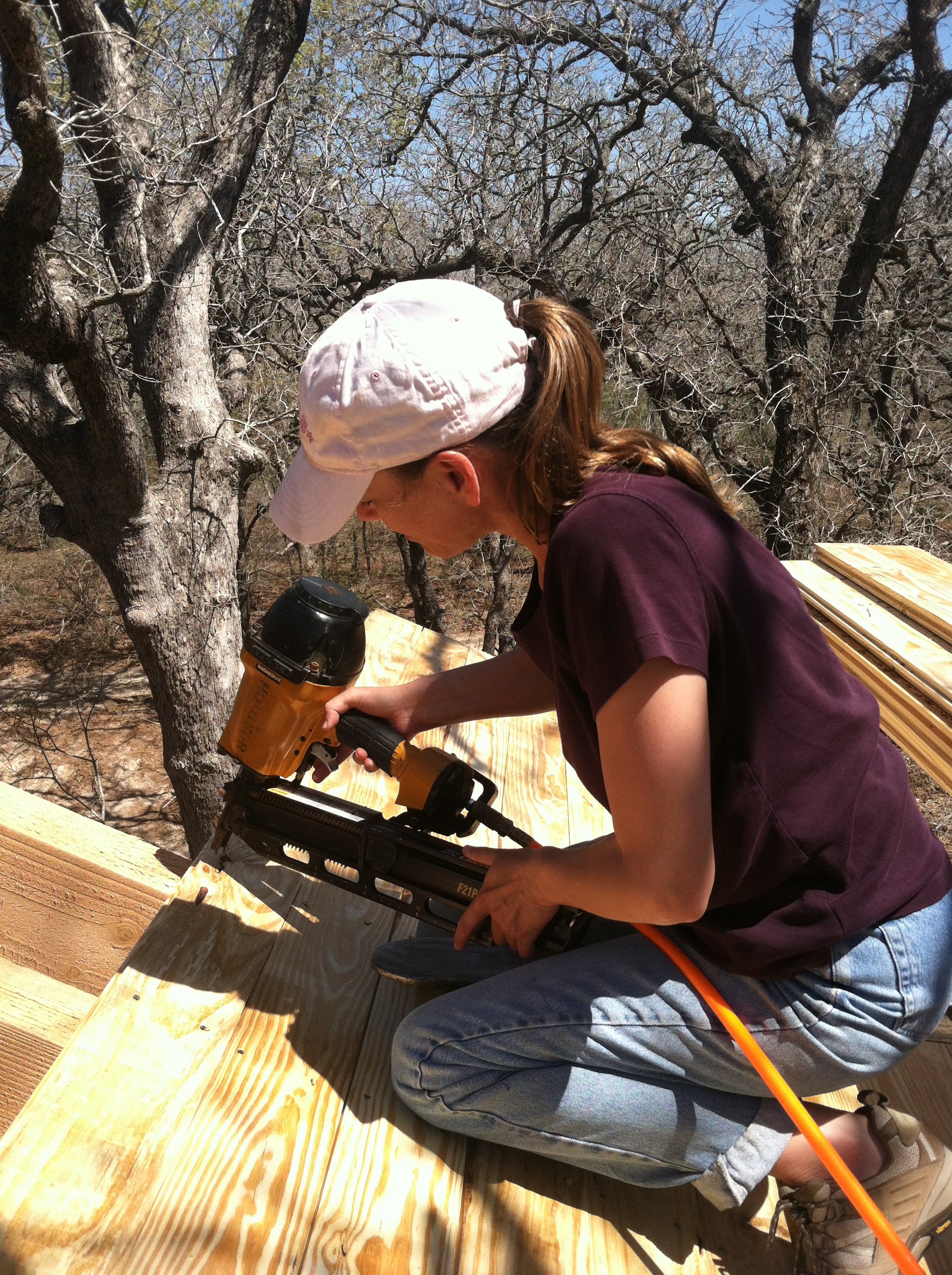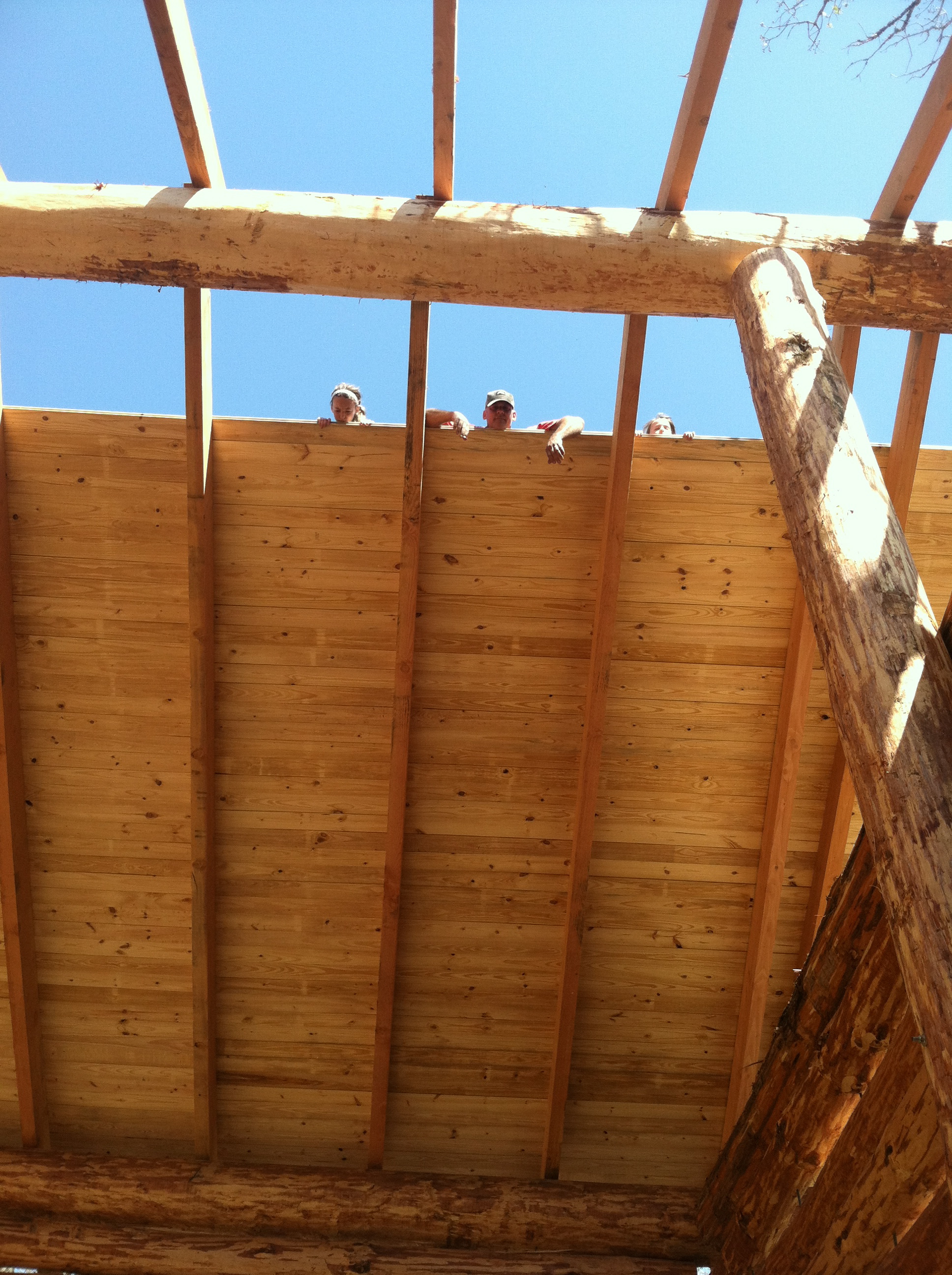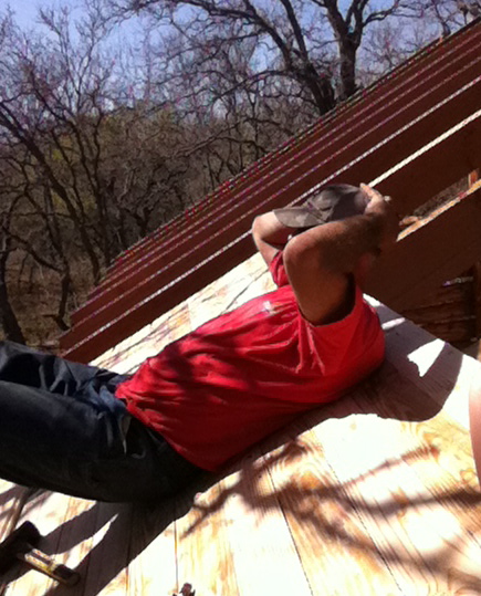 Keep in mind…we were adding height with each board. We’d set the nail gun down, and it wanted to slide down the roof, away from our reach. Every time he needed another board, he had to walk down the roof, take another, do the spin over his head trick with 40 pounds, and then walk up the roof with it. (He’s my hero.) It was HOT up there . But, I had fun (he didn’t).