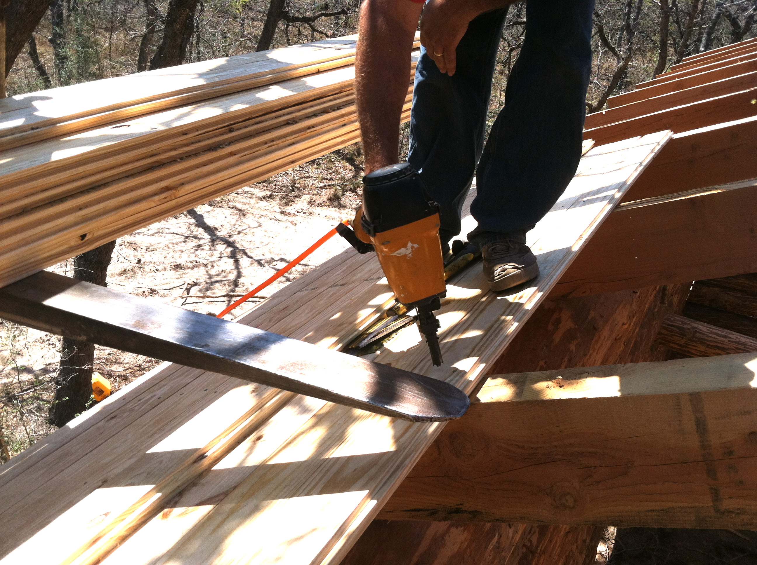 The problem we kept running into was in the overhang (which you see extending past me in the picture of me nailing). 4 feet over the edge, the tongue board wouldn’t cooperate. That’s where I came in. I”d have to crawl over there, push down on the board as best I could, and hope they would pop into place. Most of the time they did. Then I’d grip them together until Steve nailed his end, and then brought me the gun to my side. Sometimes he had to come over and apply good ‘ol sledge hammer to the tongue board to bash it in.