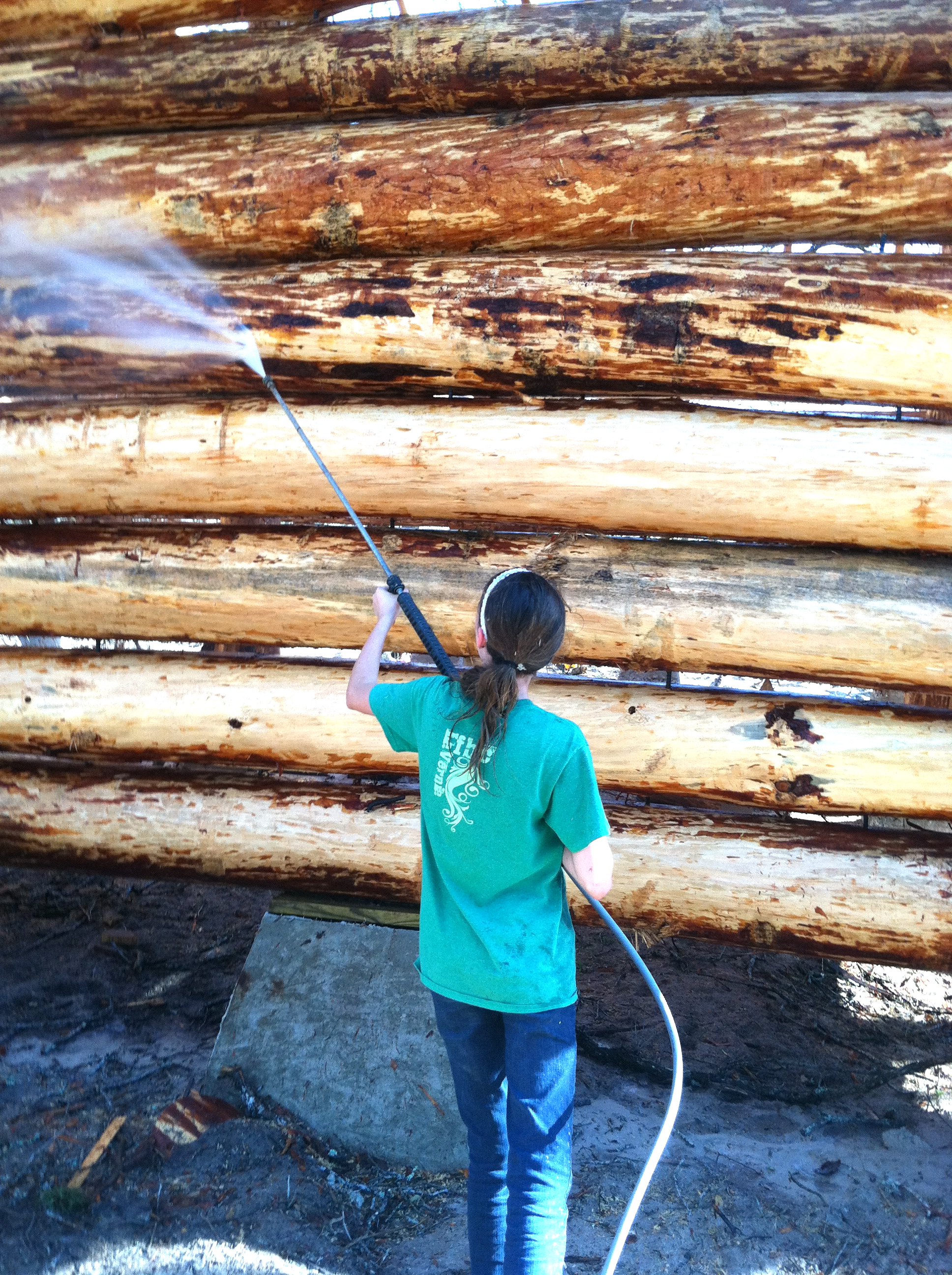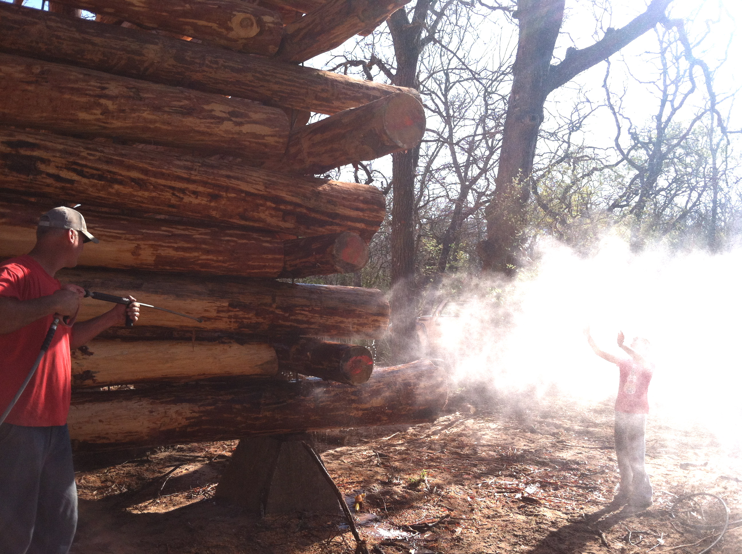 Then it was time to pressure wash. What a PERFECT job to do when you’re ROASTING HOT! That’s just the over-mist…he’s aiming at the wall.
