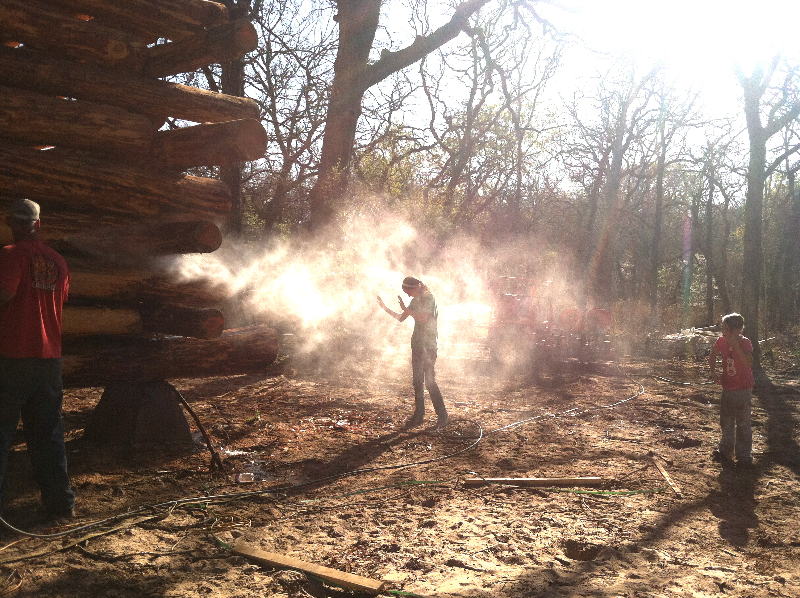 It was now time to do the opposite side of the house. I think the girls had about all the roofing fun they could handle, though. Reiley took over the telehandler, taking Steve and I to the roof for nailing. Then the girls retreated to engage in more “artistic” work. They made Native American Indian villages. Again…I was pretty impressed. Not bad for an hour.