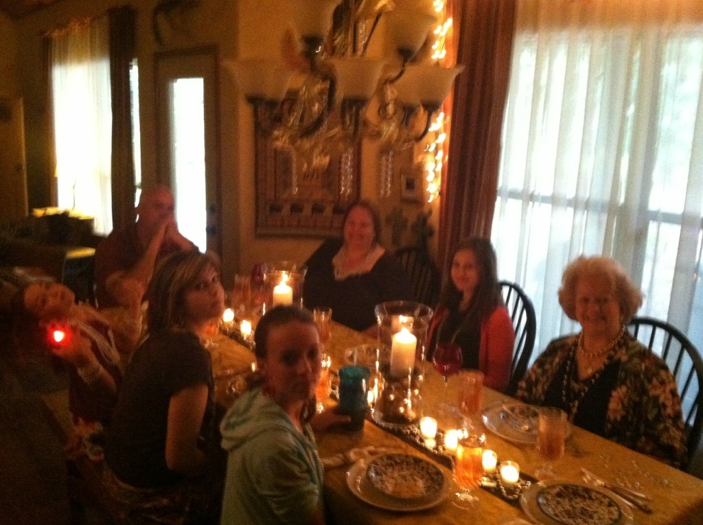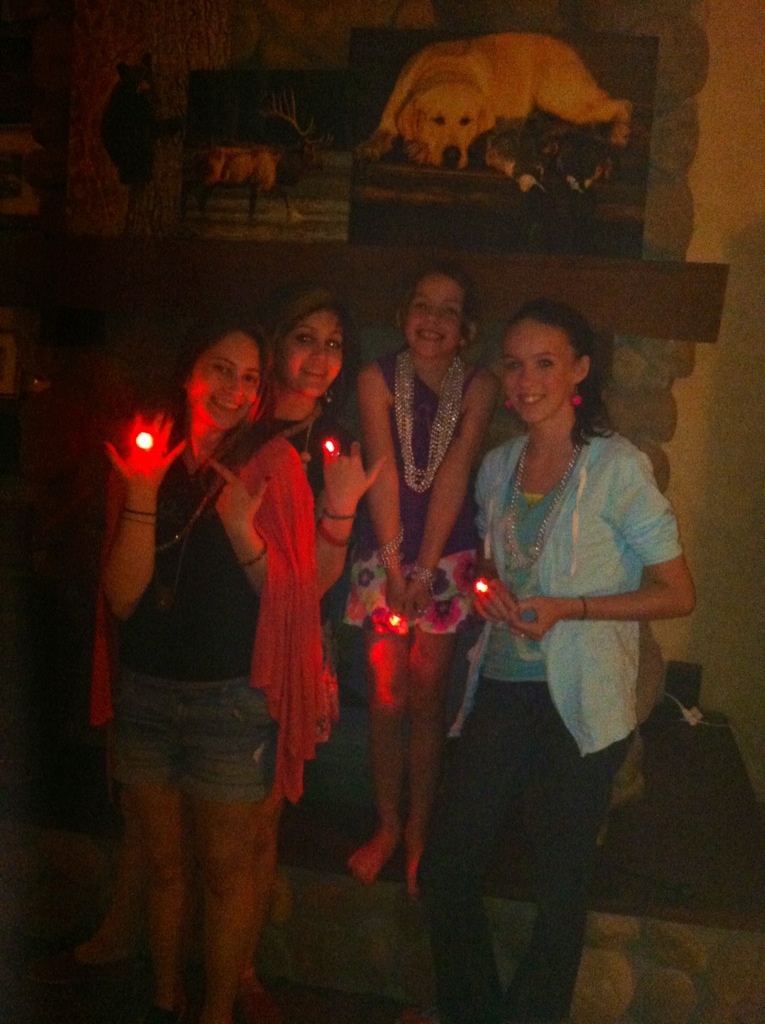 The girls and I decked out the table with gold and fake diamonds, even dripping them from the chandelier, and cooked her a 3-course meal. We told my family to come wearing BLING. They came with layers of necklaces and bracelets, and glow rings! My mom was wearing every gold-colored necklace she owns. We pulled out the sparklers, too. She had a fabulous night.
