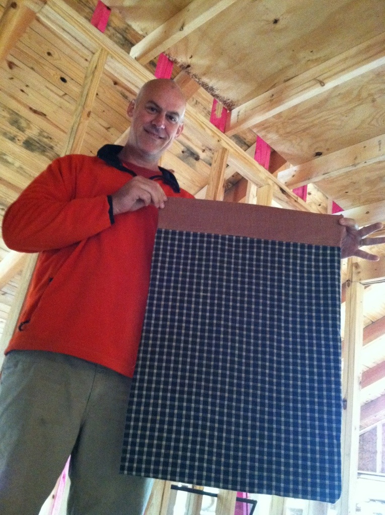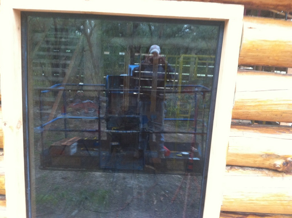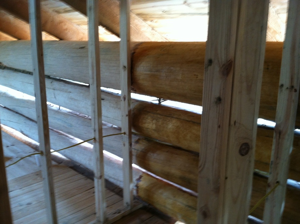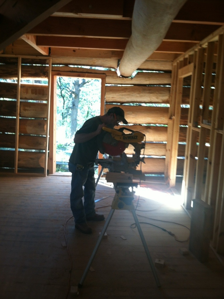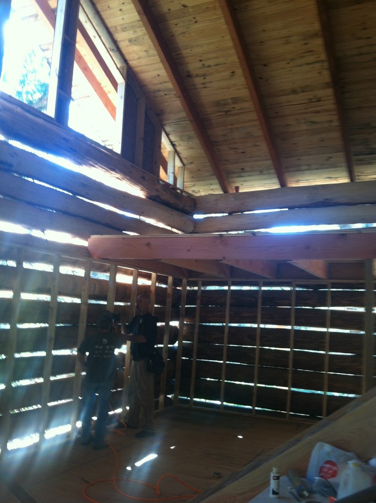 We also started staining the logs inside, and putting in insulation between them. Each log needs two coats of stain and a clear top coat (that’s 3 coats…by hand! MY hand.). In these pictures, only one coat of stain has been applied, and no clear coat, yet.