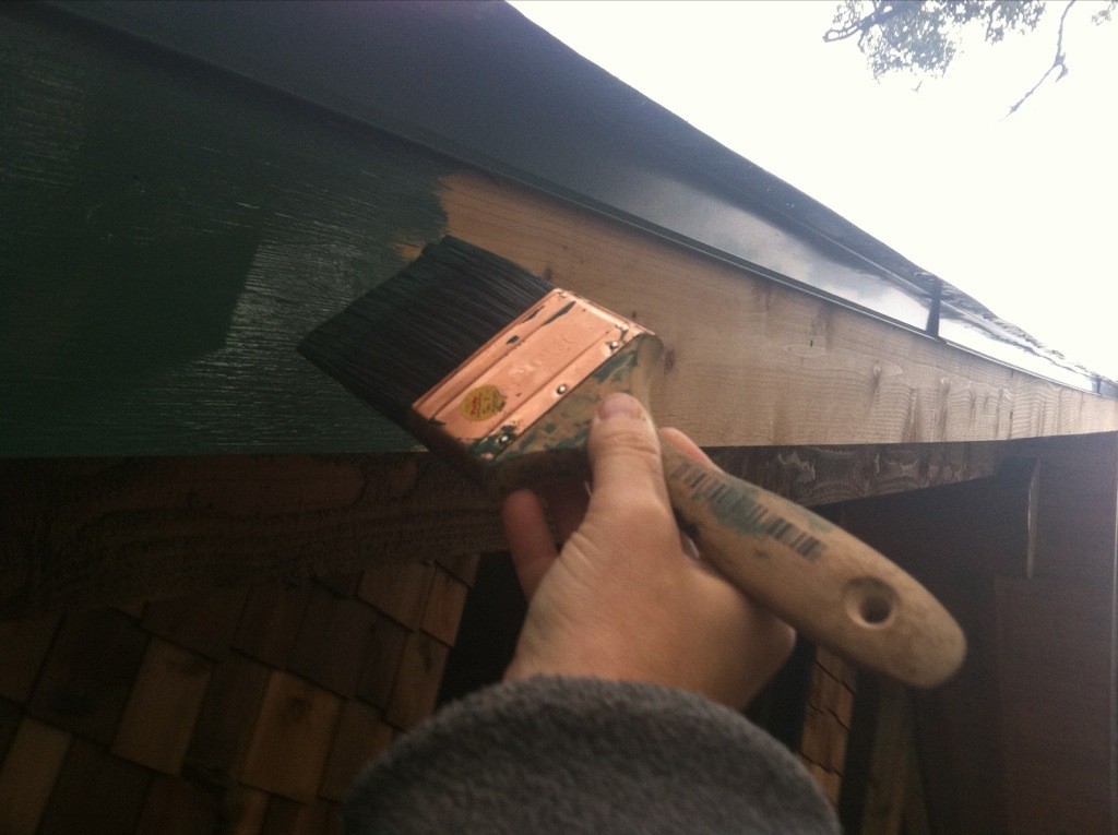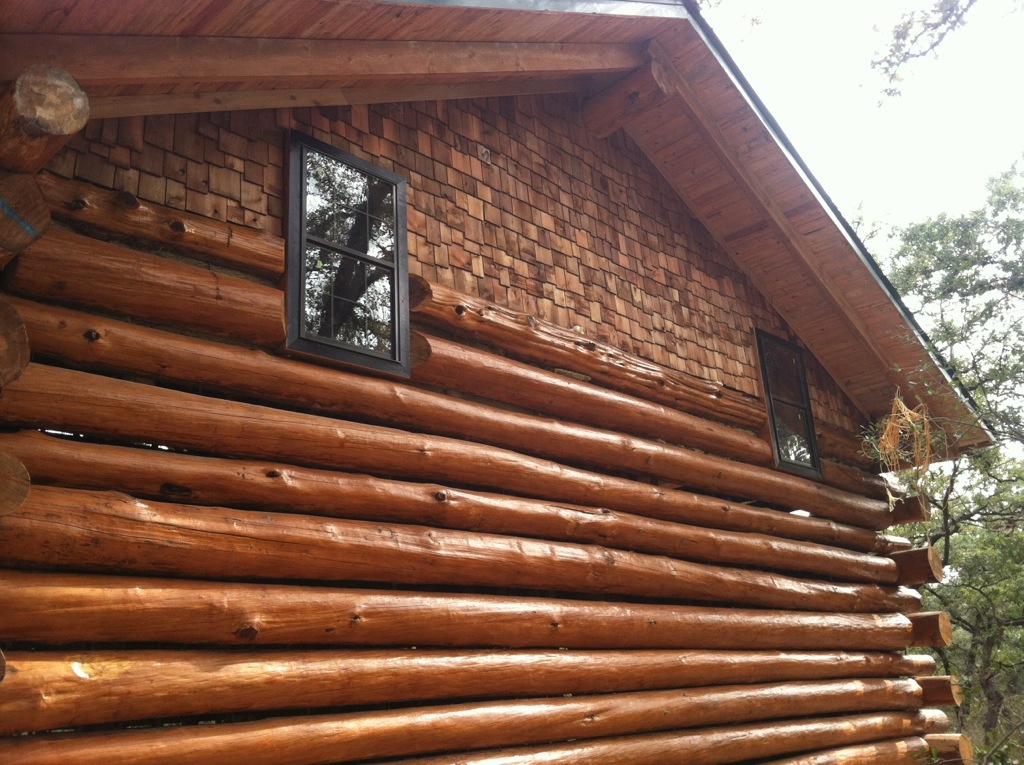 Using it, I’ve stained every log twice, painted all four fascia boards (roof trim that “faces ya”) twice each, all our window trims twice, sprayed every inch of our wood overhangs three times (twice with bleach and once with water sealer). Then I sprayed water sealer over the cedar shingles on both sides of the house.
