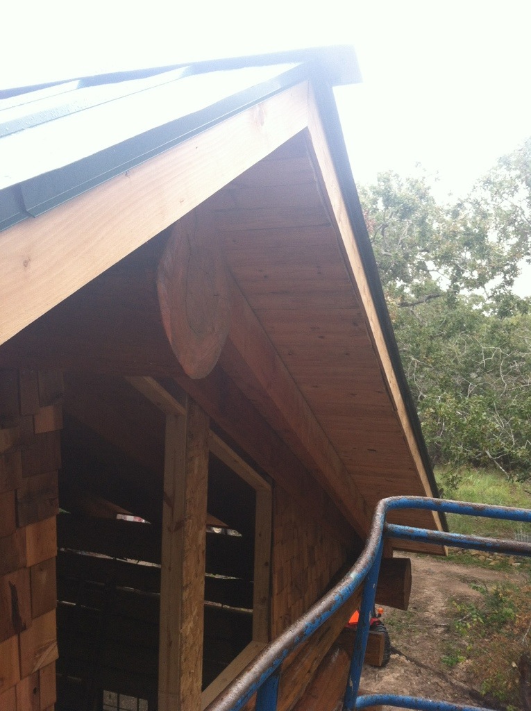 The spray foam insulation company came to insulate our roof with foam. Steve installed our metal roof. We finished our cedar shingle gables. Steve wired the whole house. He installed the glass, bay window and has our other living room windows in our trailer ready for installation.