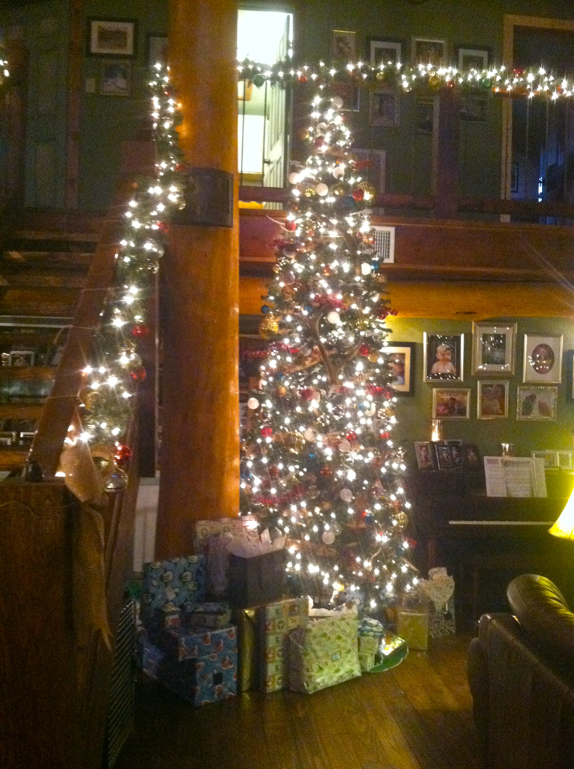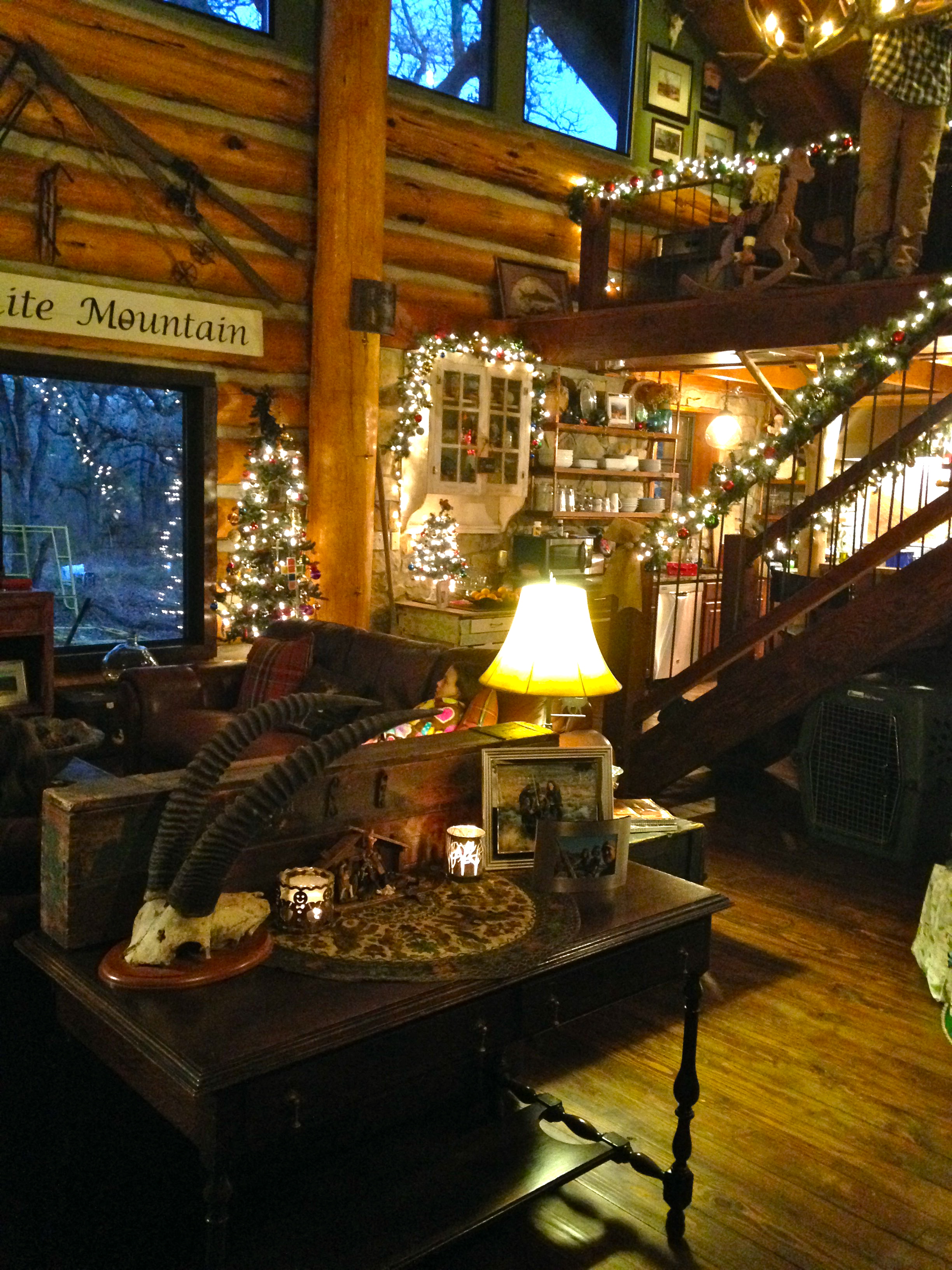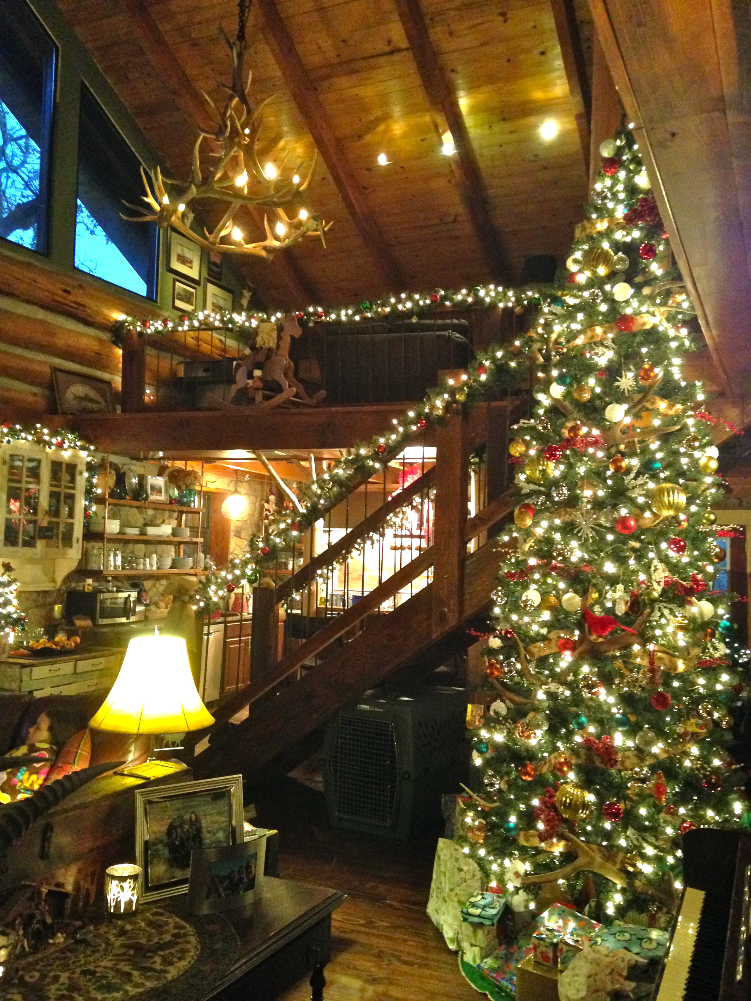 The small tree on the table was my grandmother’s.  The tree, the white base it’s in, and the wooden angel ornaments on it are all over 75 years old! In the next picture, the taller tree by the table is filled with ornaments my children have made since birth, and the rocking chair in the loft was made by Steve for Reiley when she was 2, for Christmas…and his mom made the Santa that’s sitting on it. Heritage. 🙂 Love it!