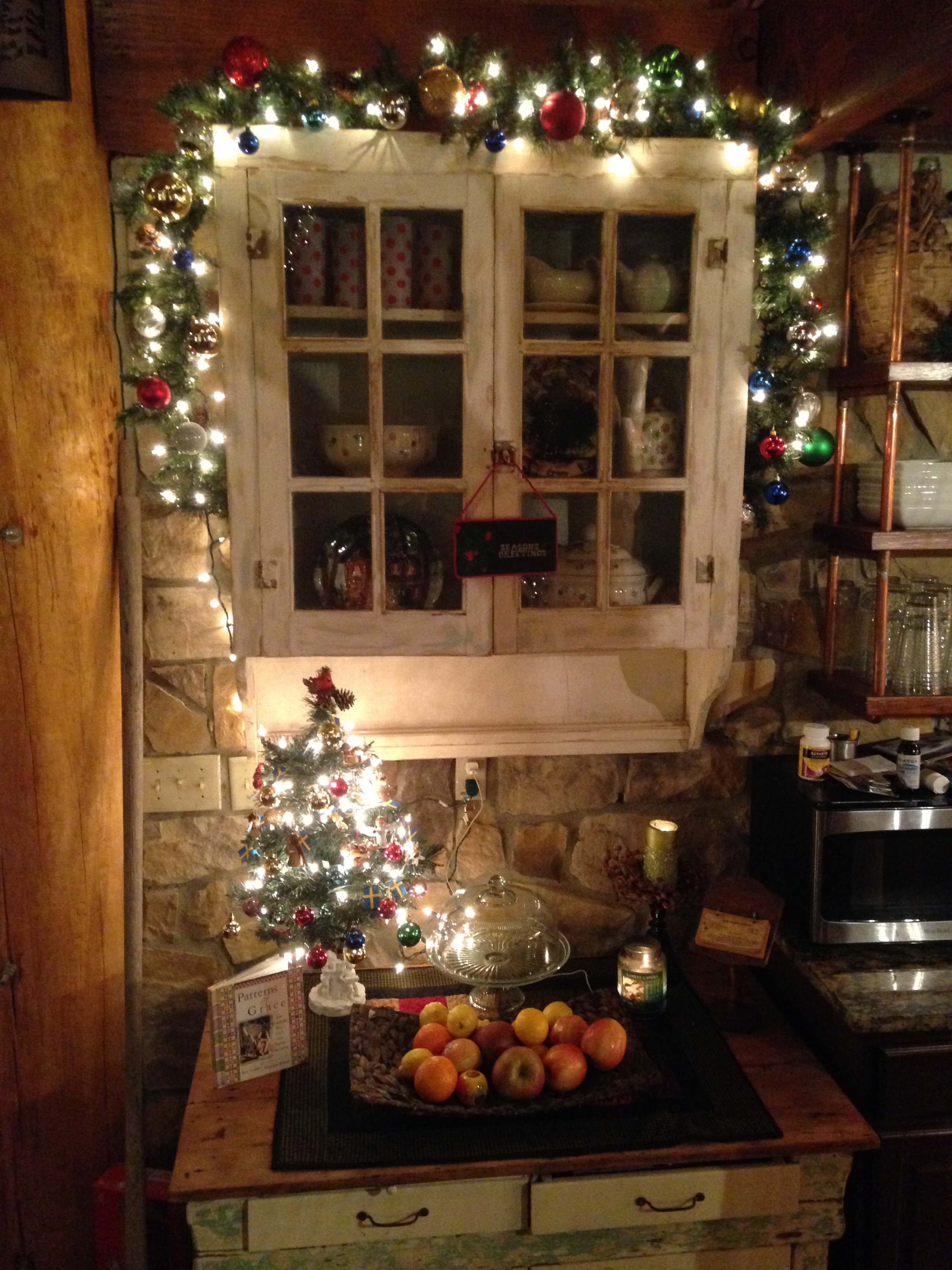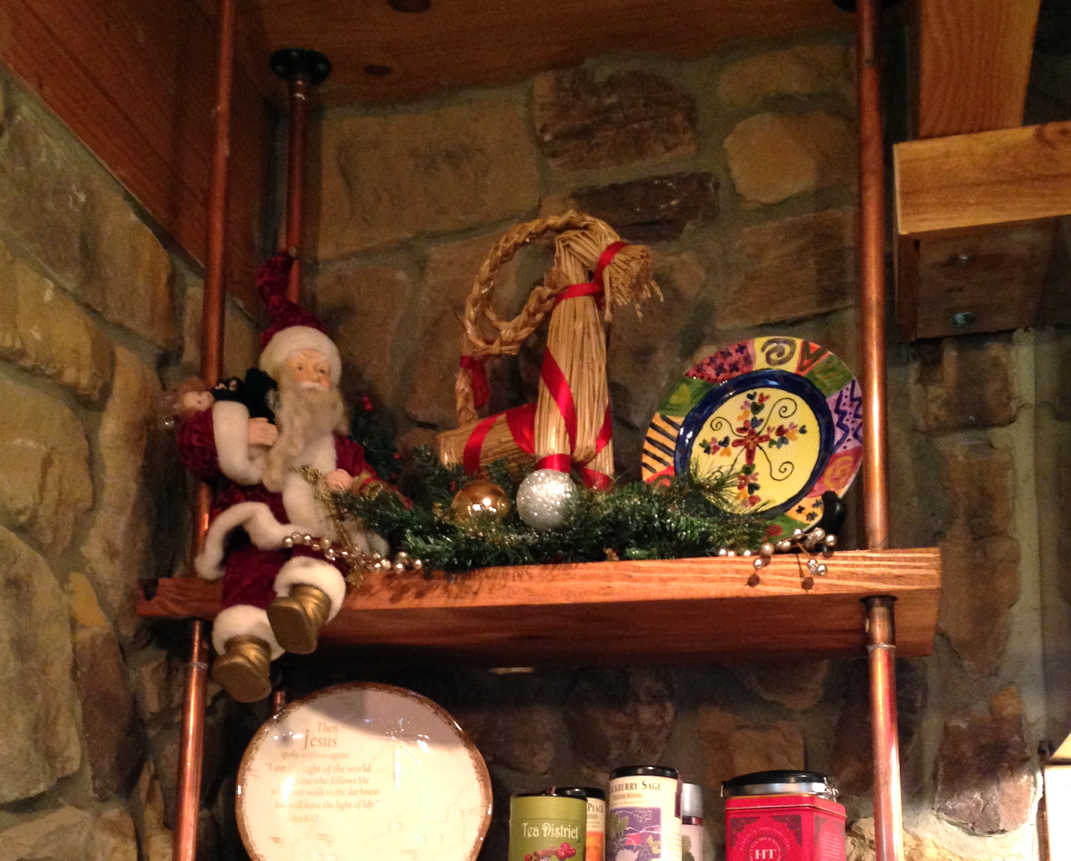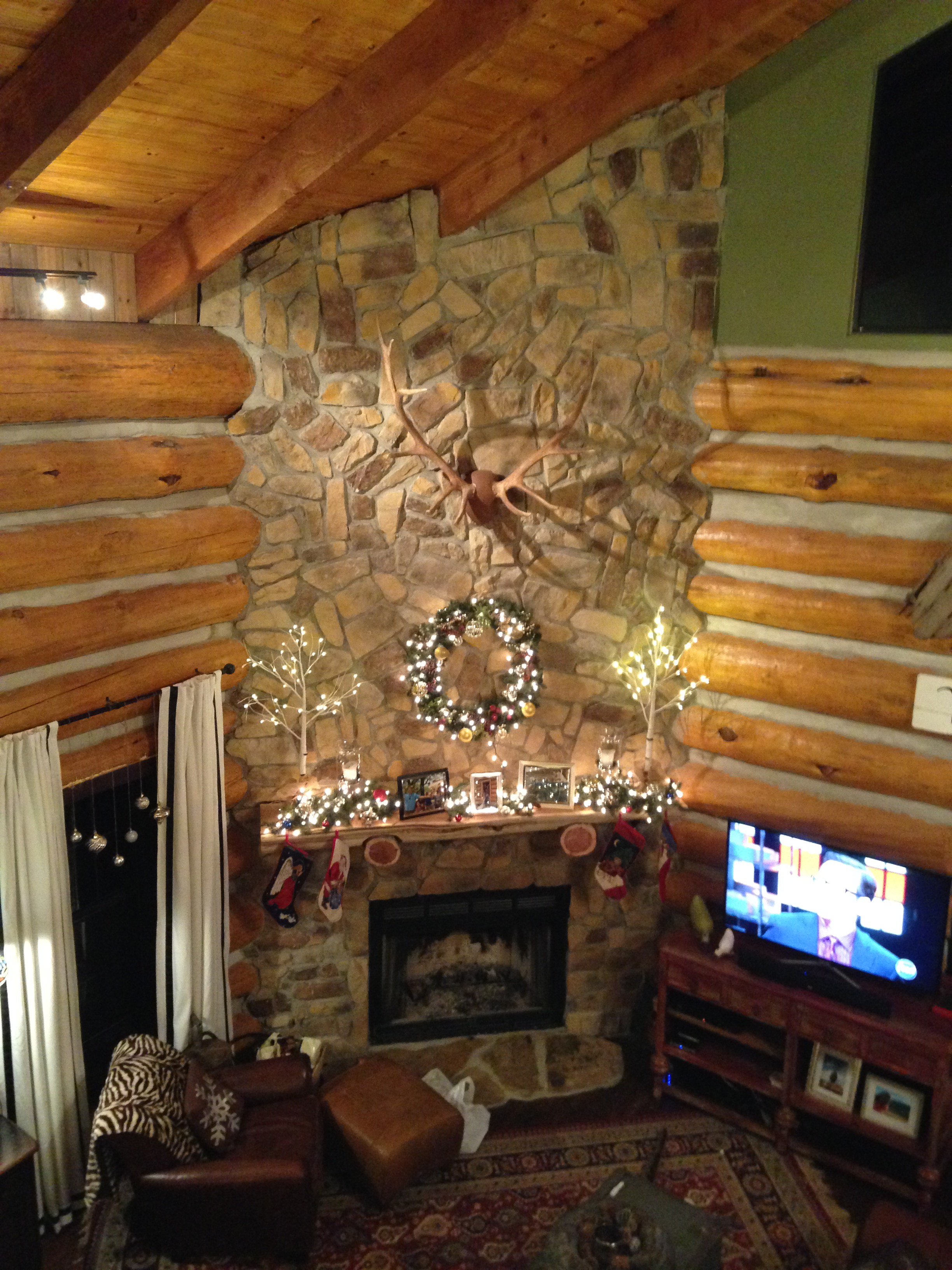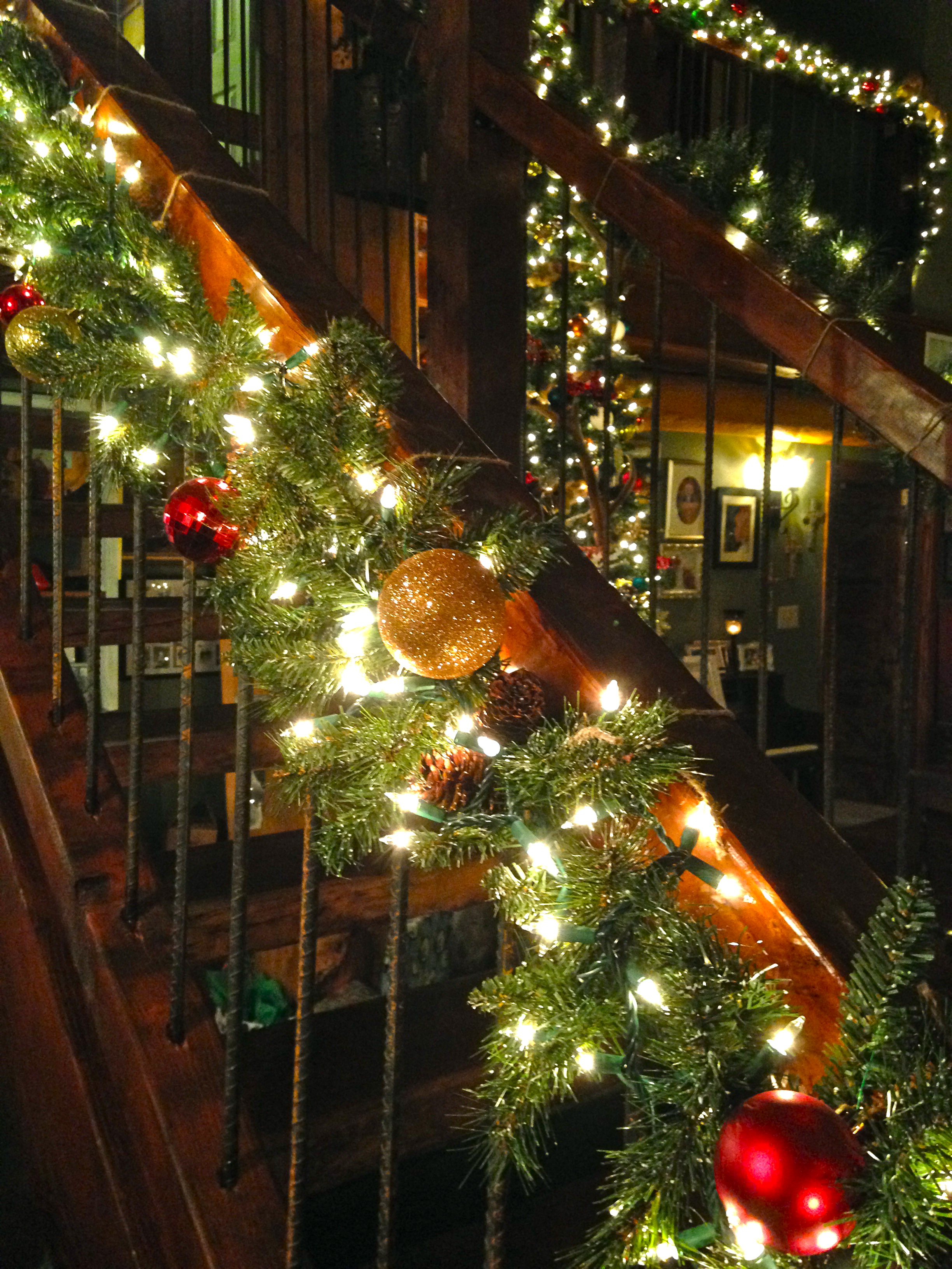 The small tree on the table was my grandmother’s.  The tree, the white base it’s in, and the wooden angel ornaments on it are all over 75 years old! In the next picture, the taller tree by the table is filled with ornaments my children have made since birth, and the rocking chair in the loft was made by Steve for Reiley when she was 2, for Christmas…and his mom made the Santa that’s sitting on it. Heritage. 🙂 Love it!