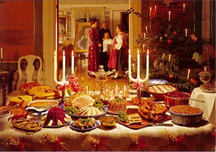 Here are pictures of a typical Swedish “Smorgasbord” and Norwegian “Koldtbord”.  My great-grandparents had tables of food like this for their Christmases in Sweden and Norway.