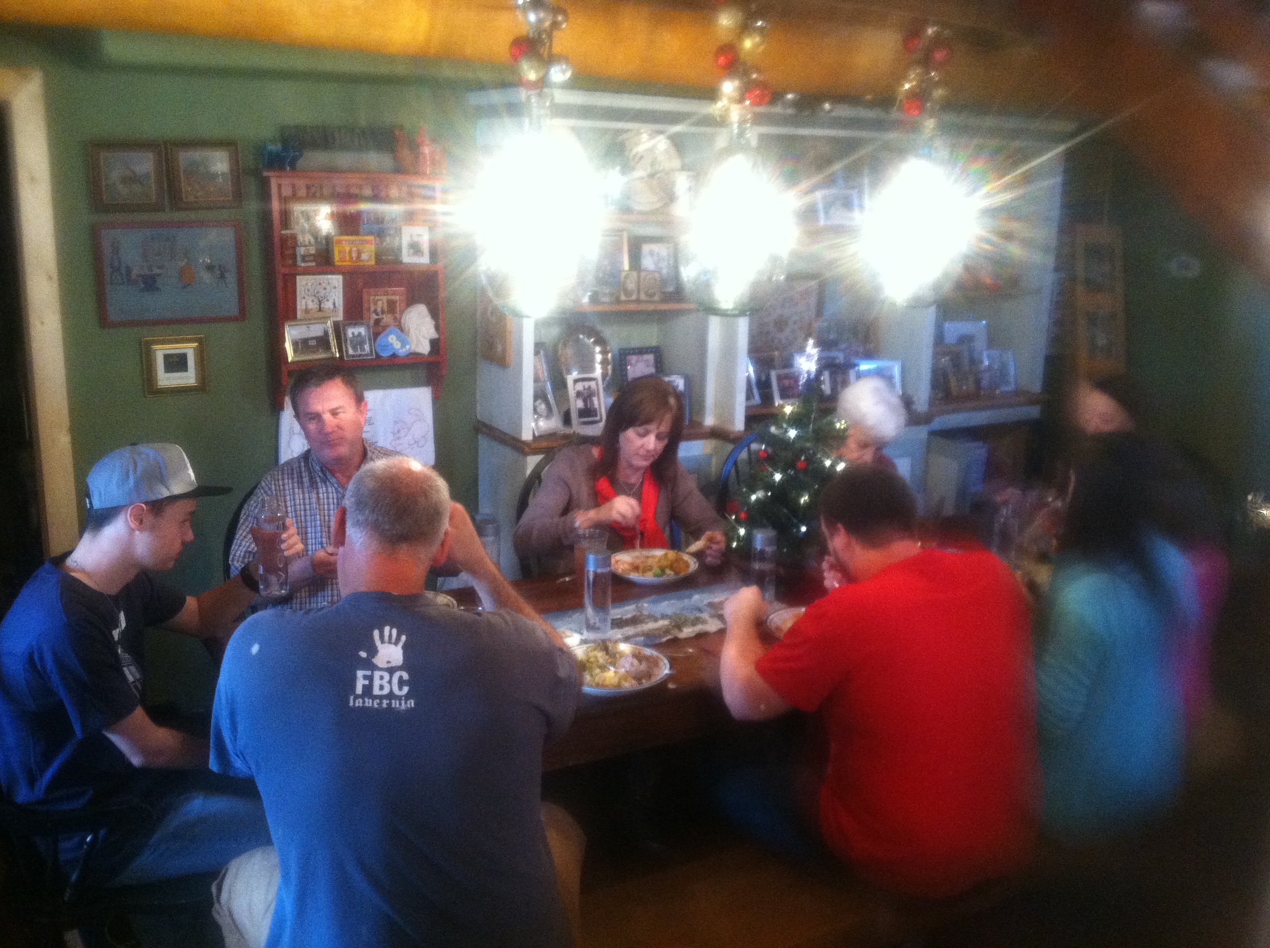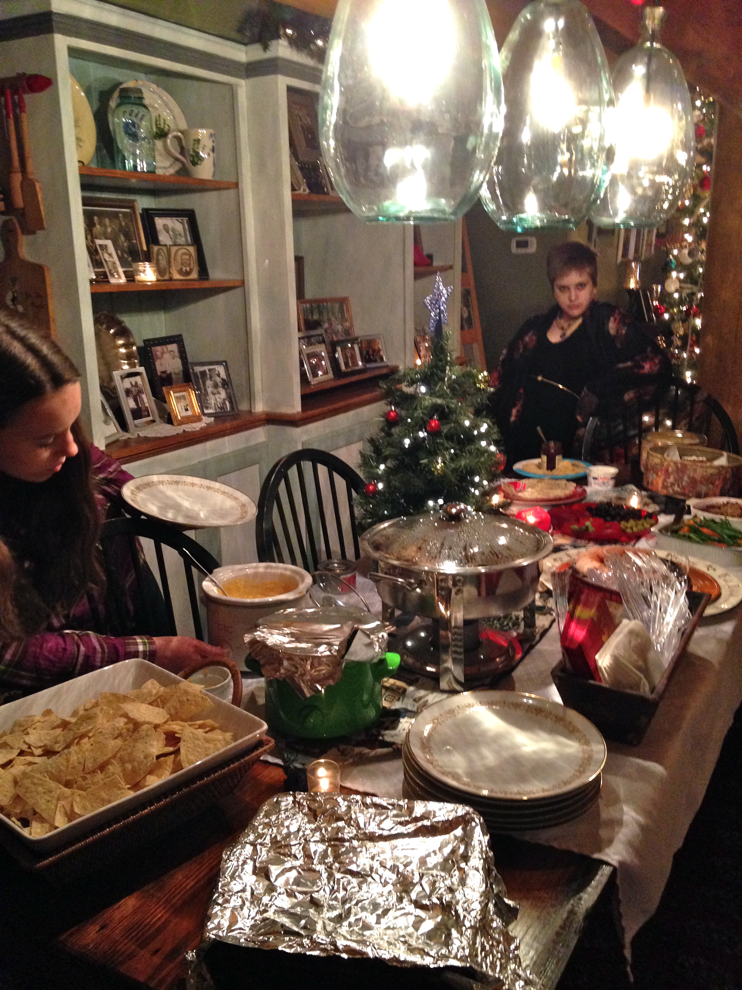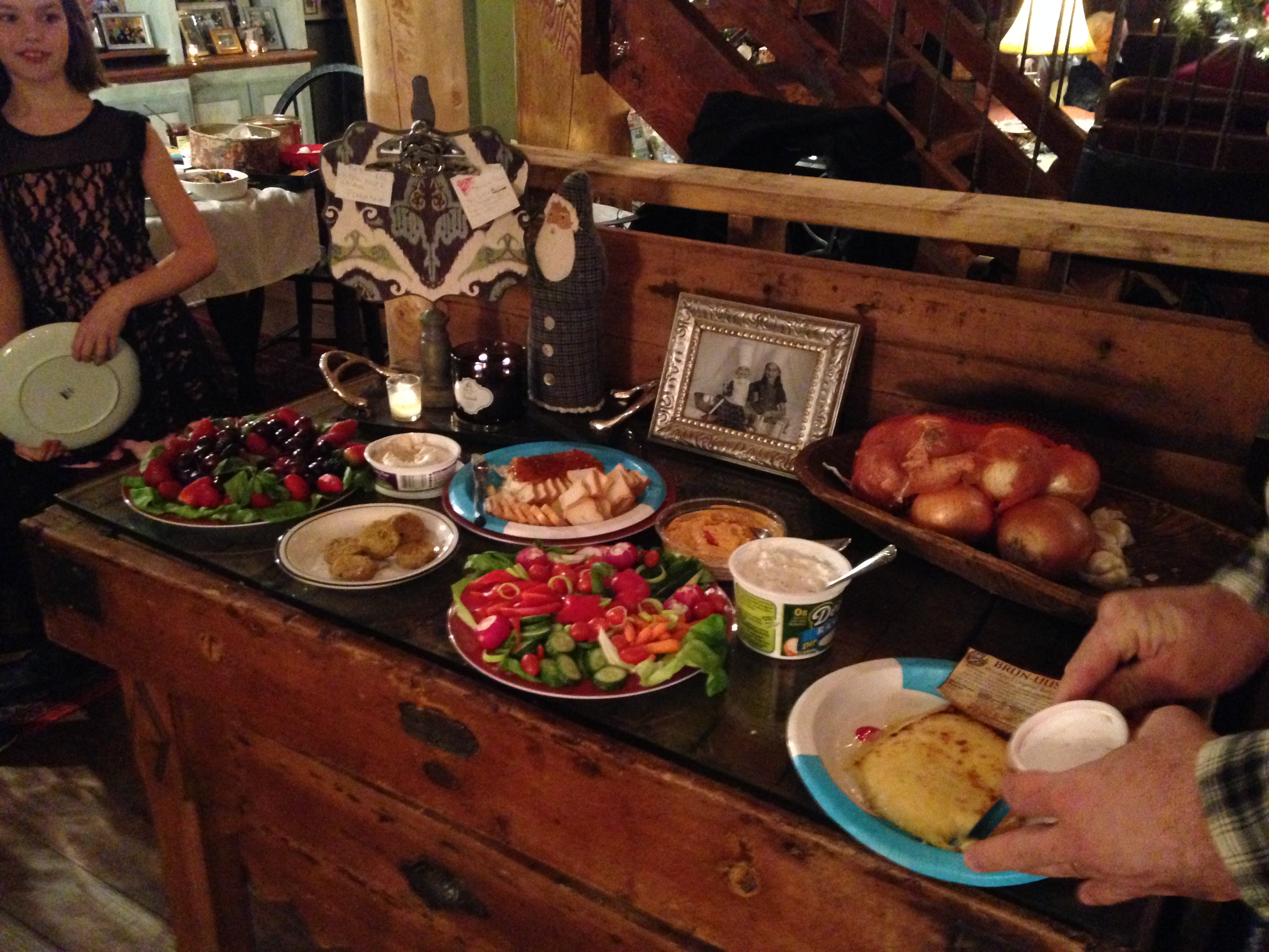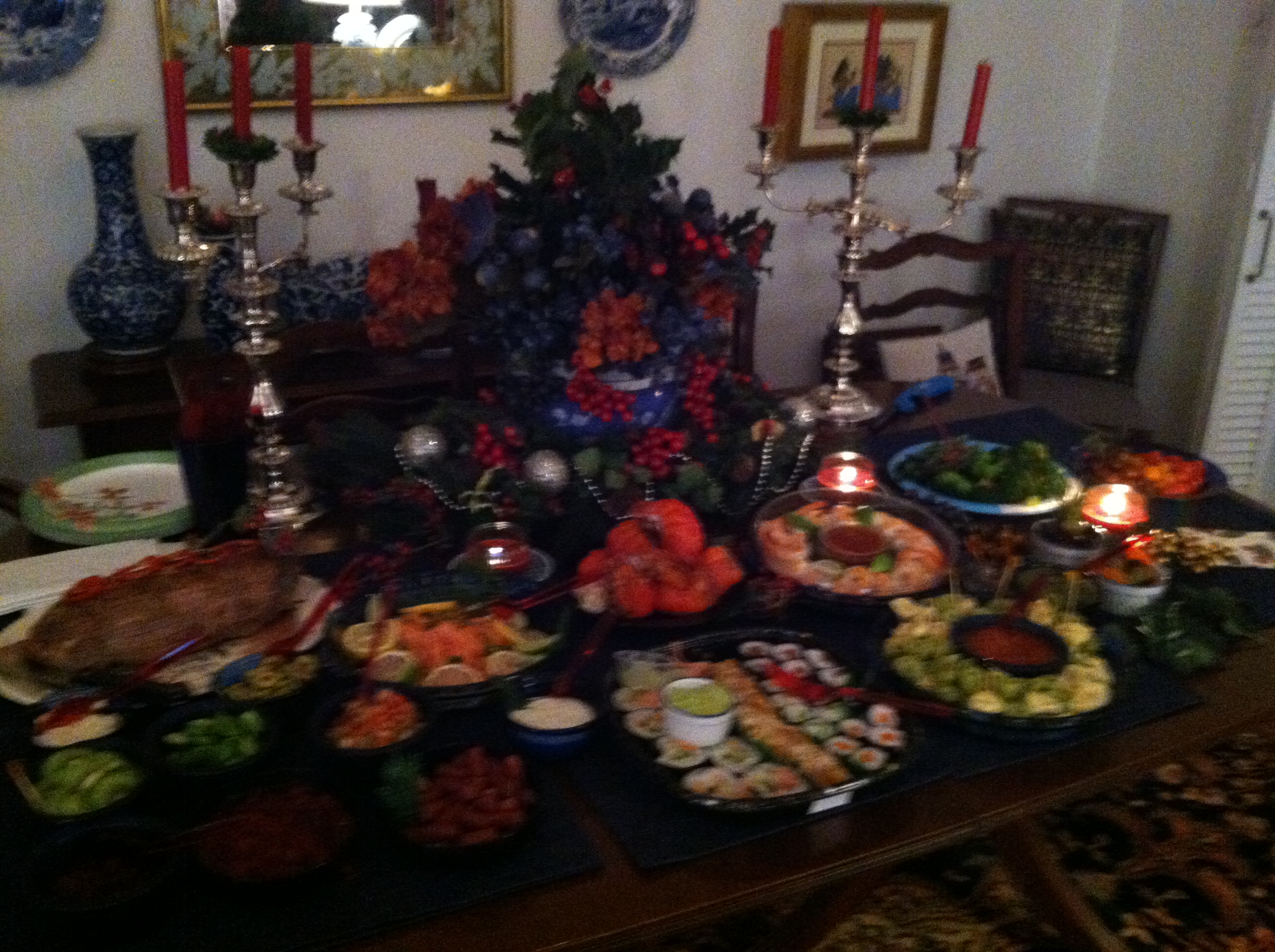 I grew up having a smorgasbord for Christmas just like those pictures, filled with only traditional Scandinavian foods that I don’t eat ordinarily.  Here was last year’s Christmas at my mother’s house (overlook the HORRIBLE quality picture…sheesh!!! It was so dark, my camera couldn’t focus).
