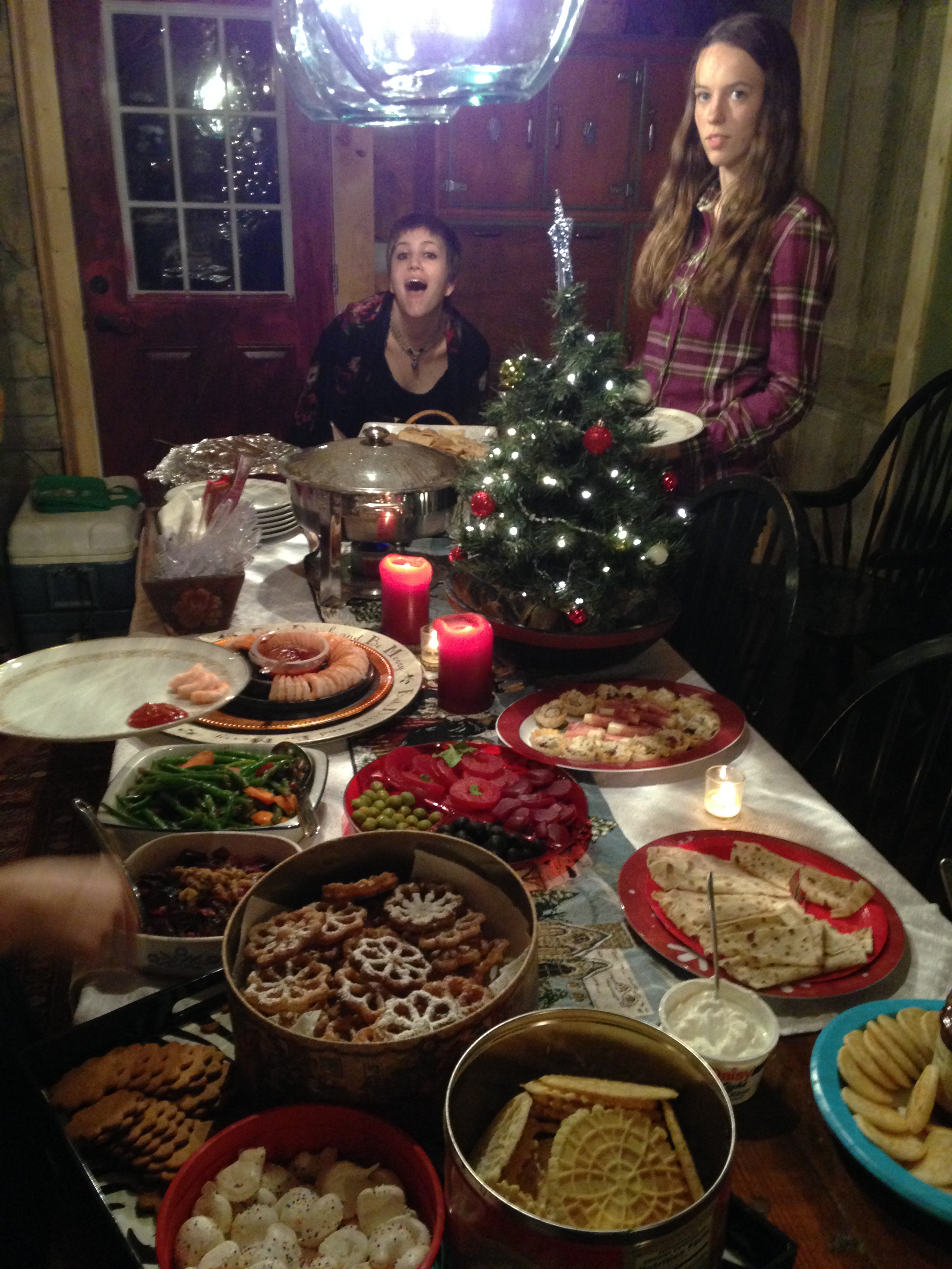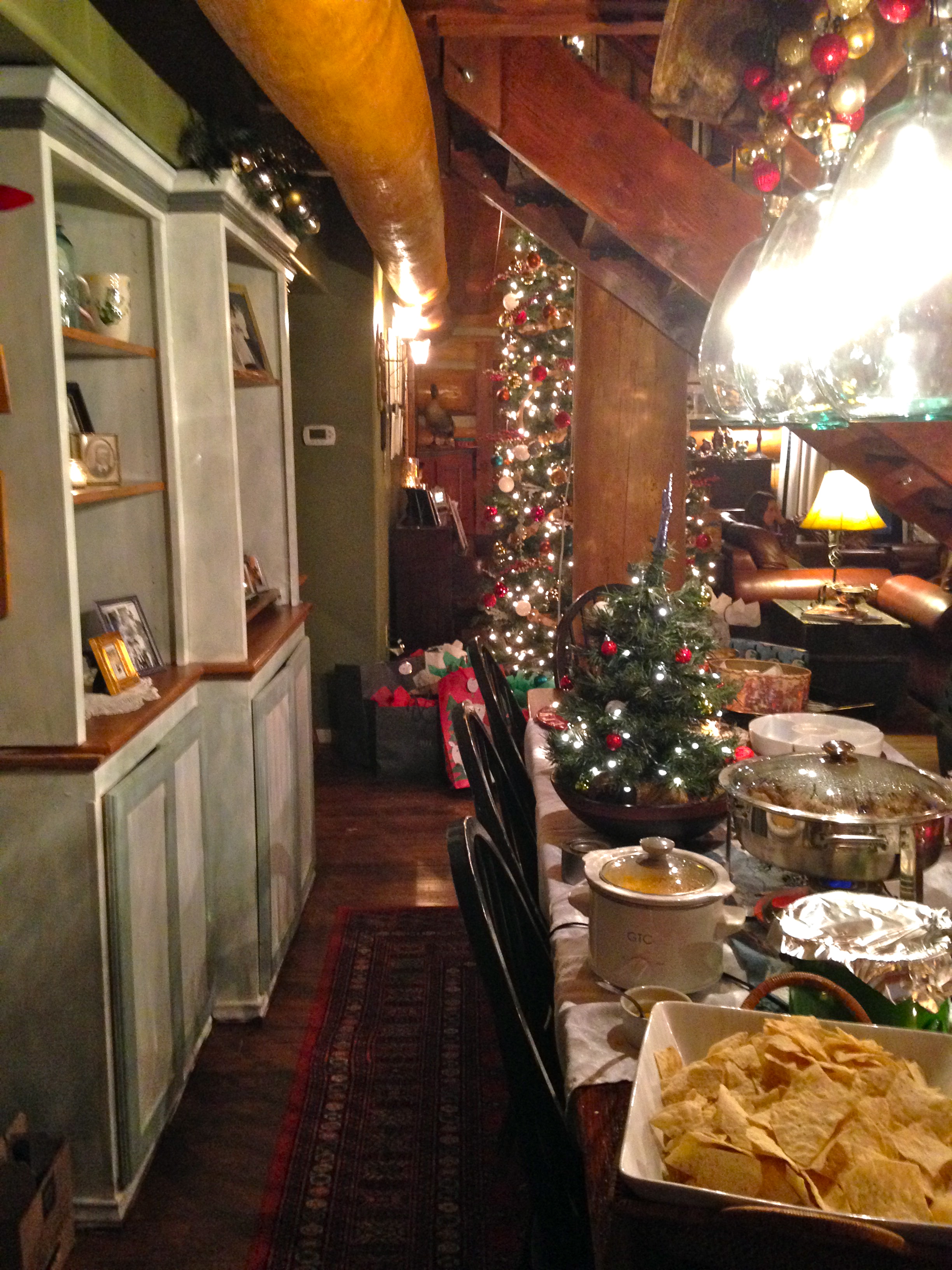 Then my mom and the crew came.  Miraculously, the gifts multiplied and the tables got really full:  Swedish pancakes with lingonberries, Swedish meatballs, Swedish potato sausage, Scandinavian cheeses, crackers, breads, Swedish Lefsa (potato-based tortilla), vegetables/dips, olives, shrimp cocktail, smoked white fish, sardines, and of course….chips and queso (hot cheese dip), because we’re also TEXANS. (Yeee HAW!)  All foods I’ve been eating for Christmas since I can remember.  **Note: As I took these pictures, my mother was still unloading the food.  It wasn’t all out, yet…believe it or not.