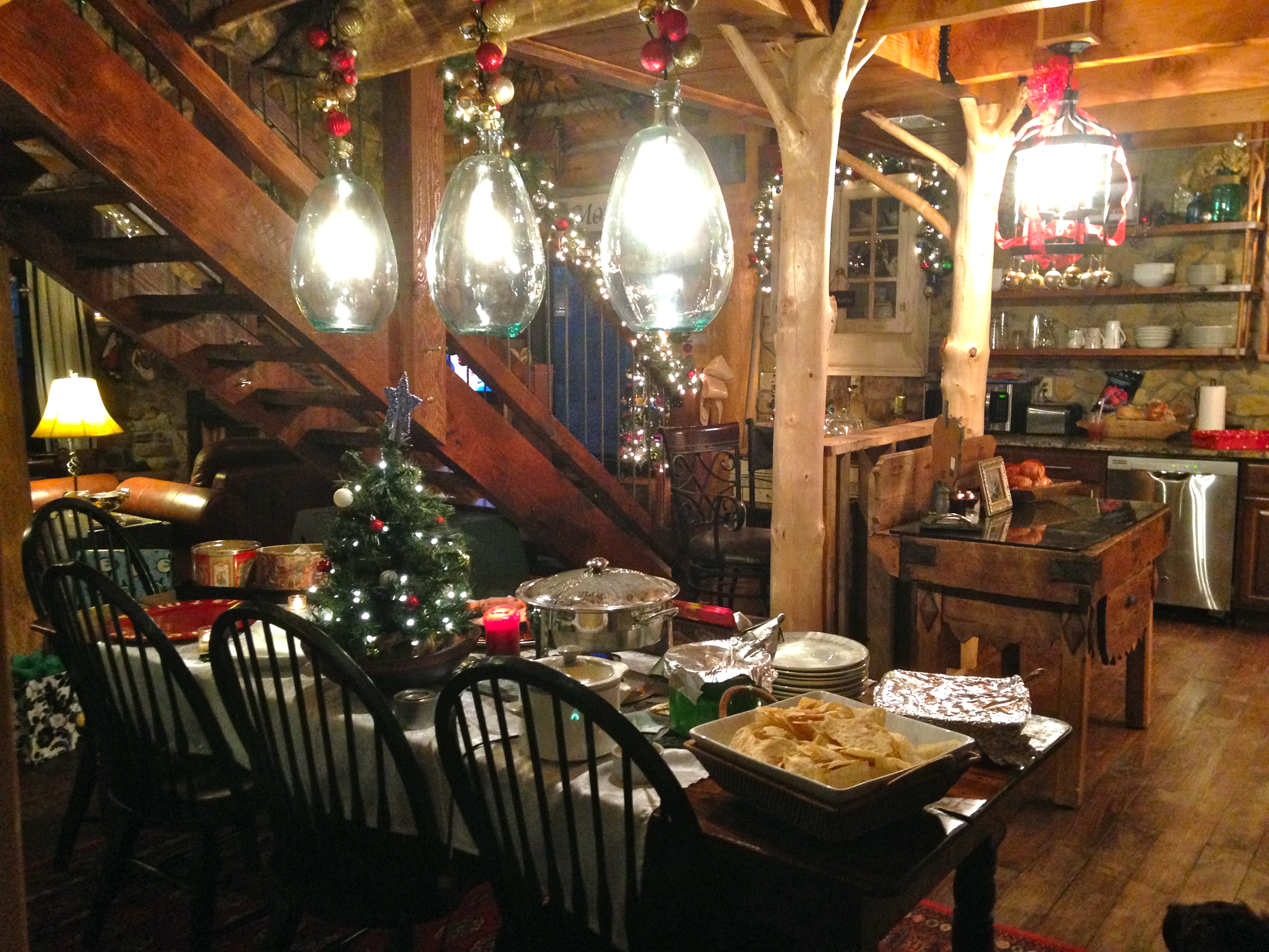Here are pictures of our home on Christmas Eve this year (2014), just before my family arrived with additional food for the “Smorgasbord”.  (I had to turn all the lights on for these pics, but I have candles lit on all the shelves, tables, and everywhere.)