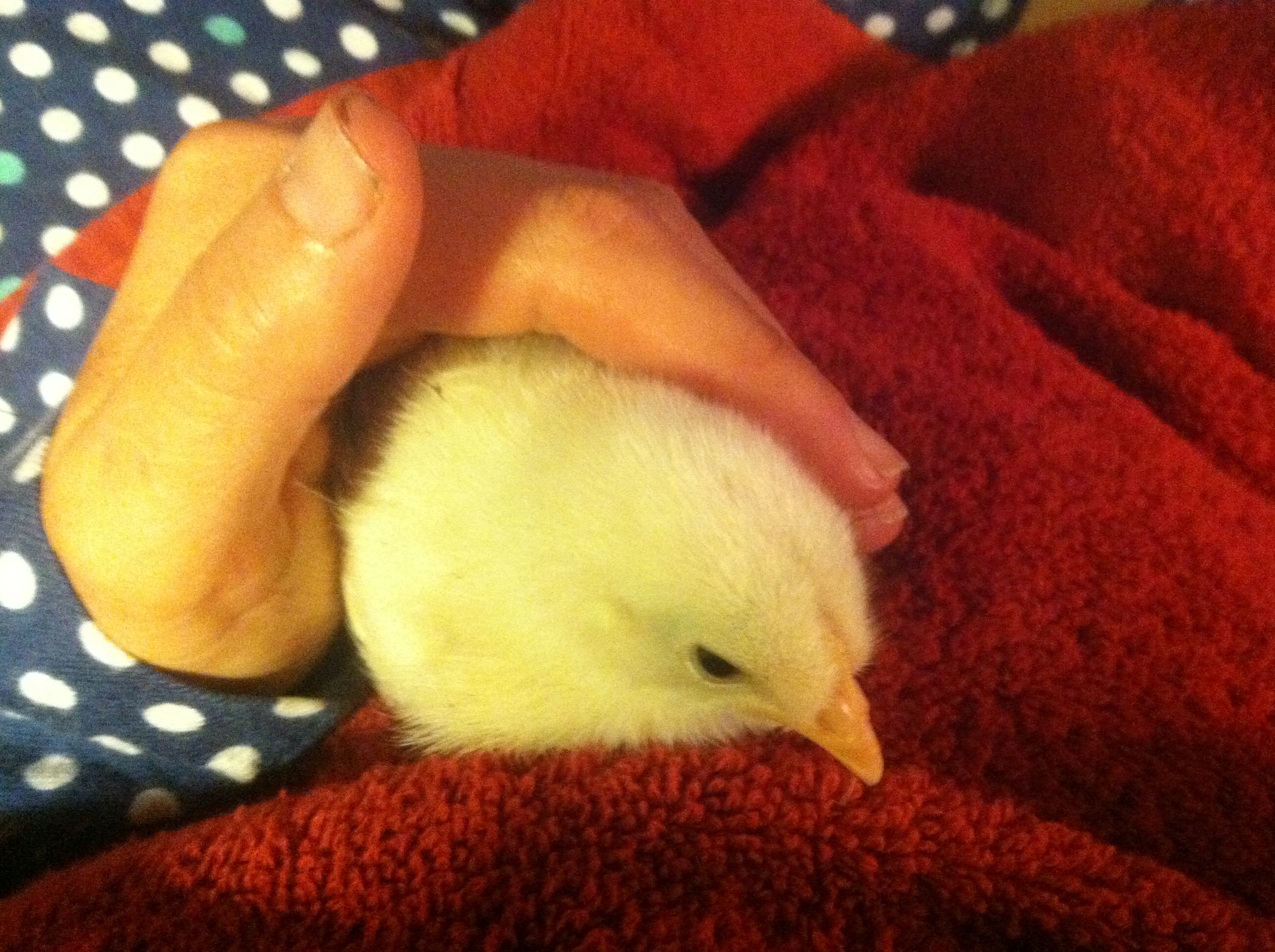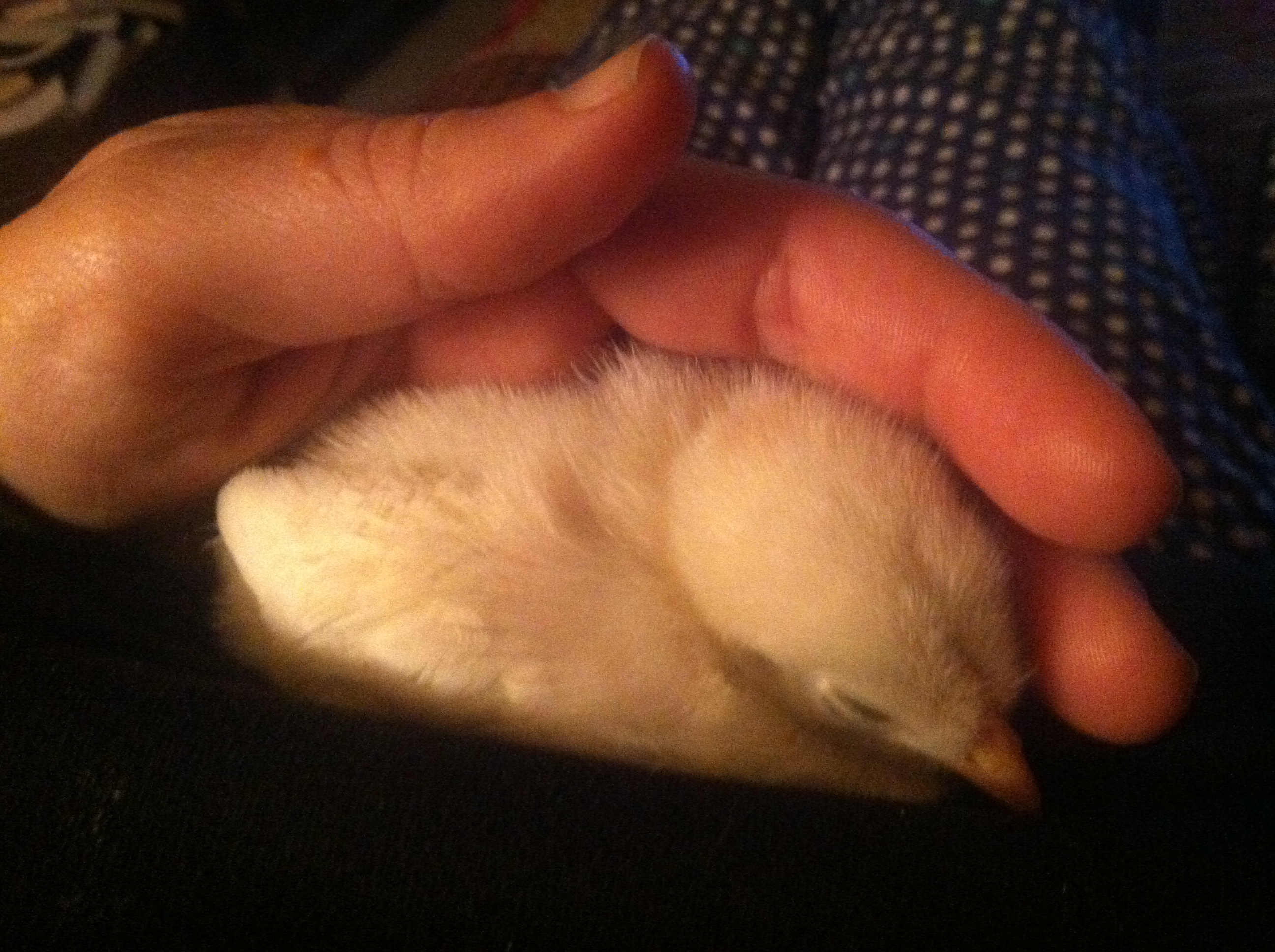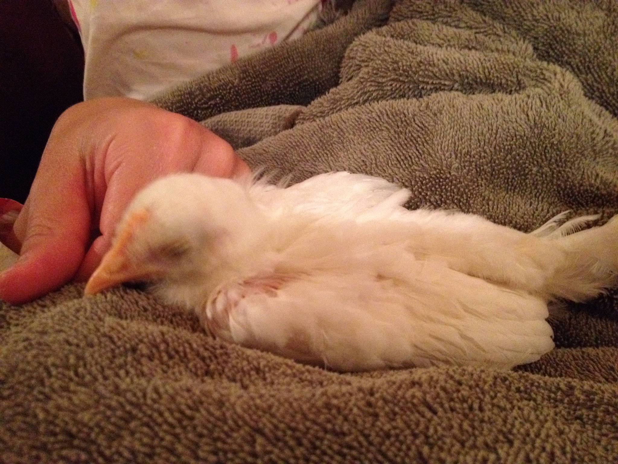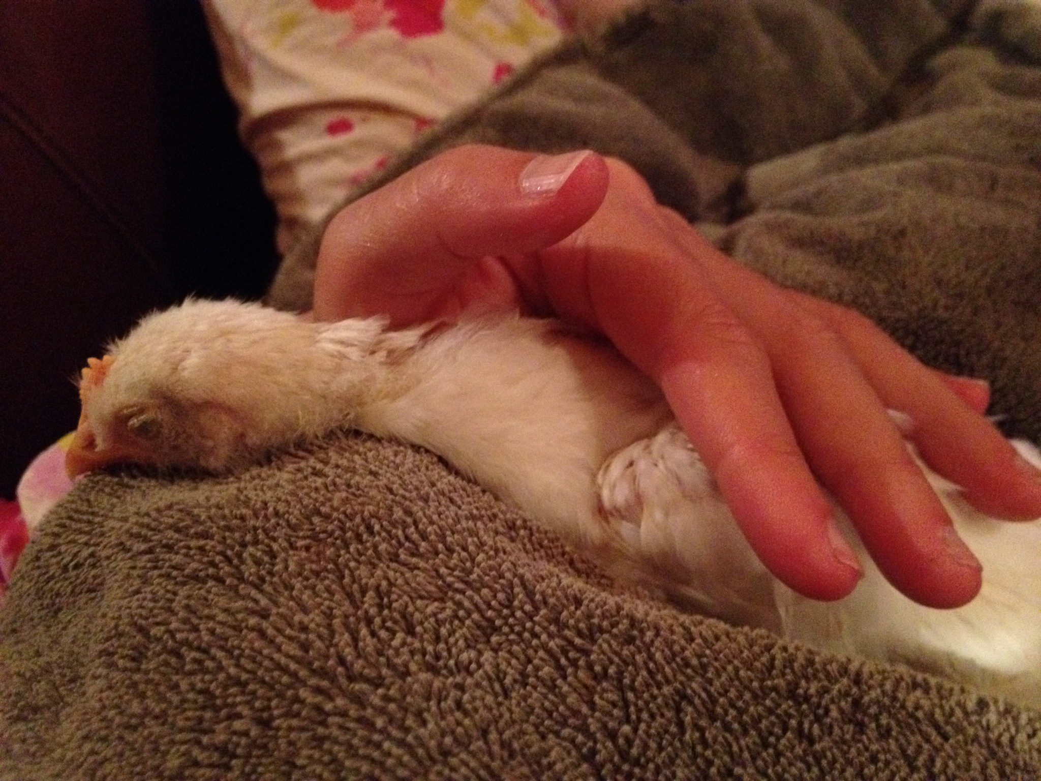 I can honestly say that I never EVER thought I’d see the day when I’d be holding a chicken on my lap while watching tv in my living room. (Did I seriously just type that sentence?)