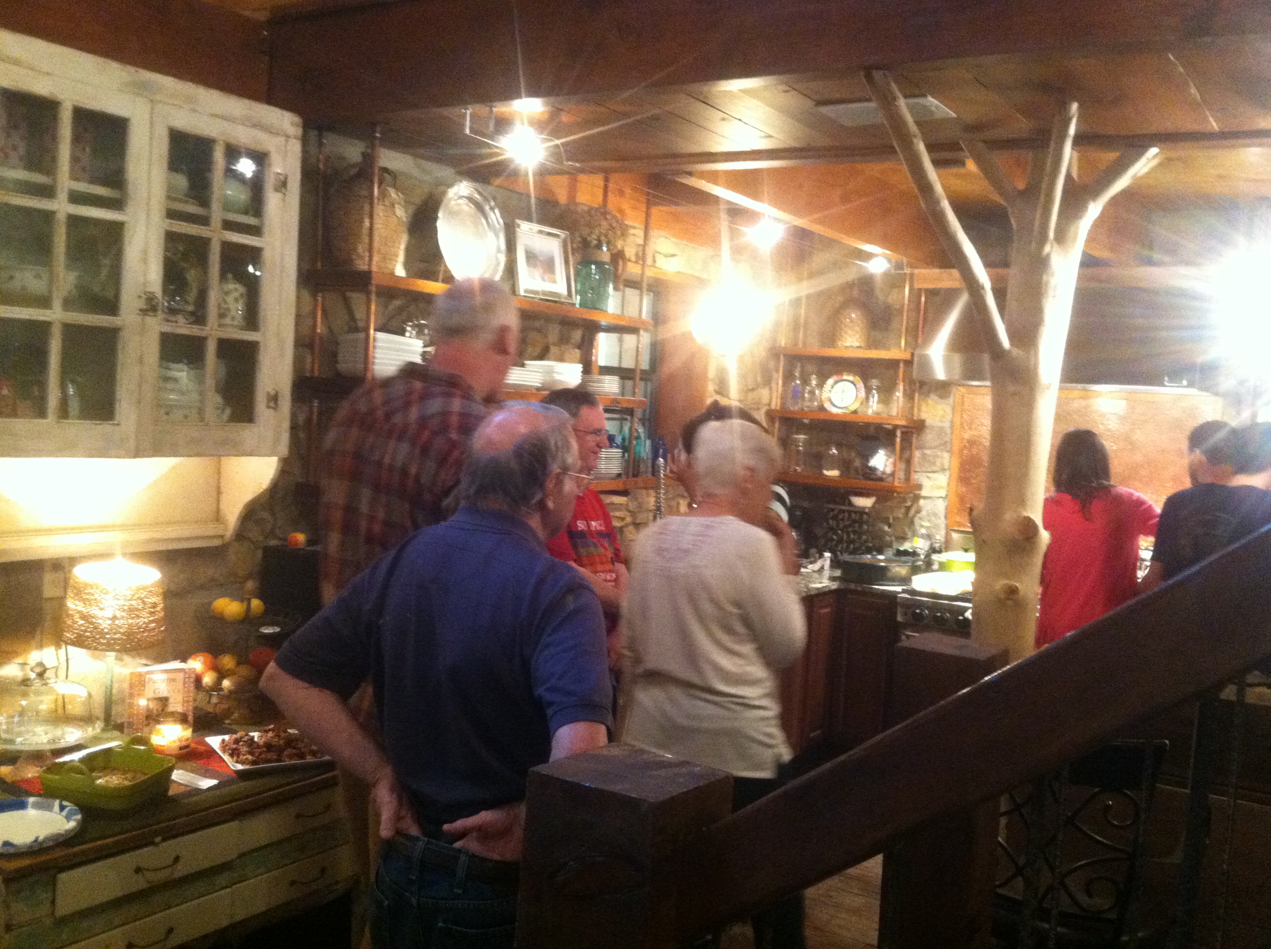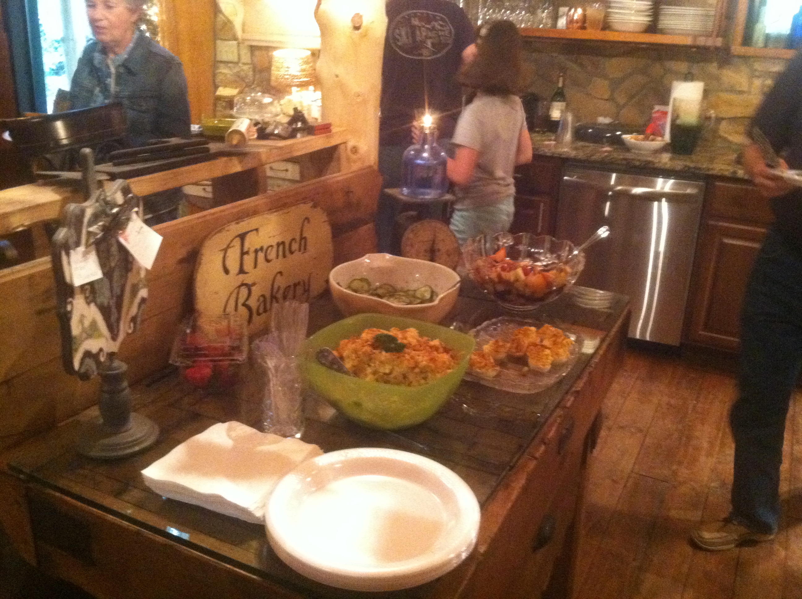 Here’s just some of the food.  The stove and red table are covered in more.   I had to get pics while no one was looking.  (Why do people hate having pictures taken when they’re eating??)  IMG_8380