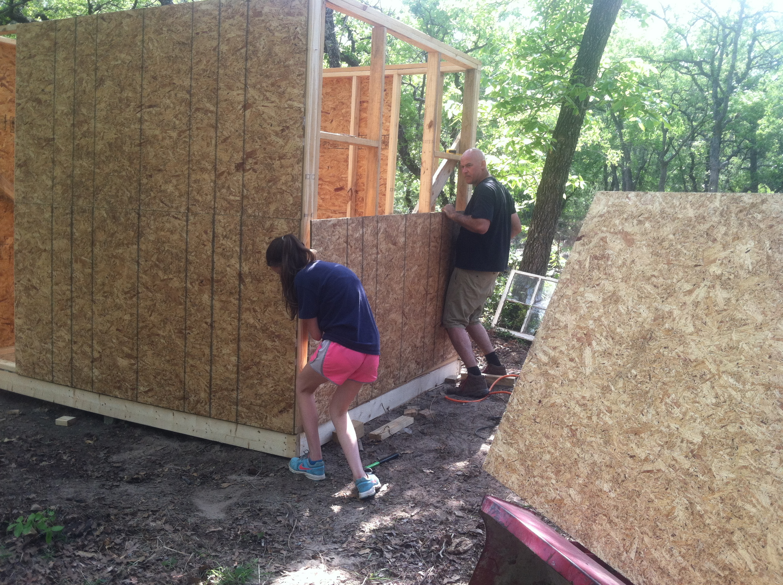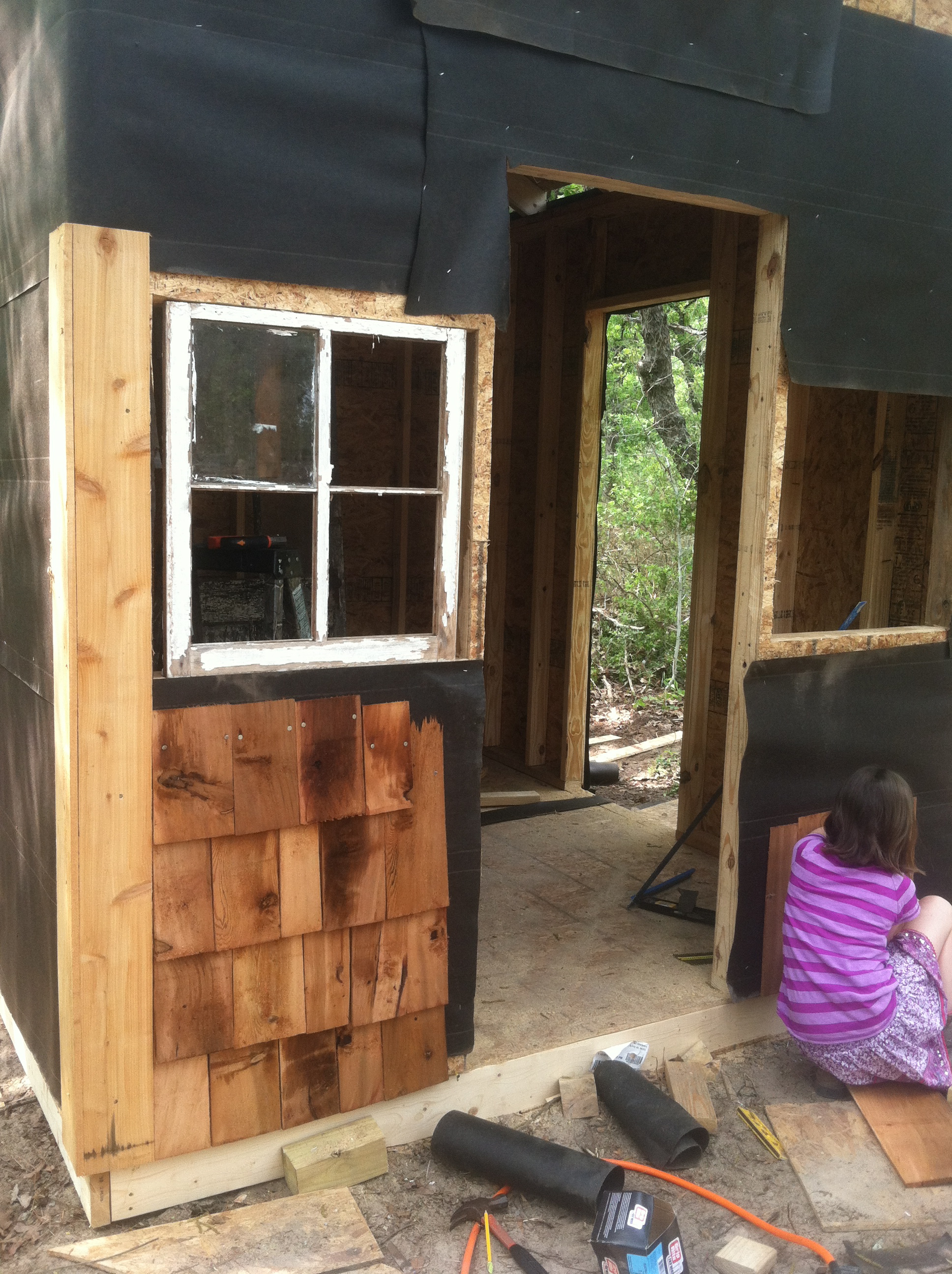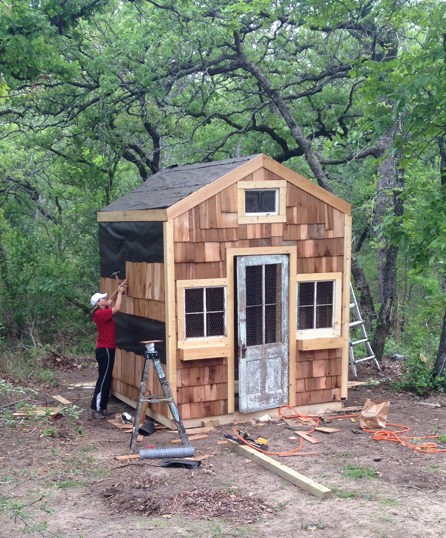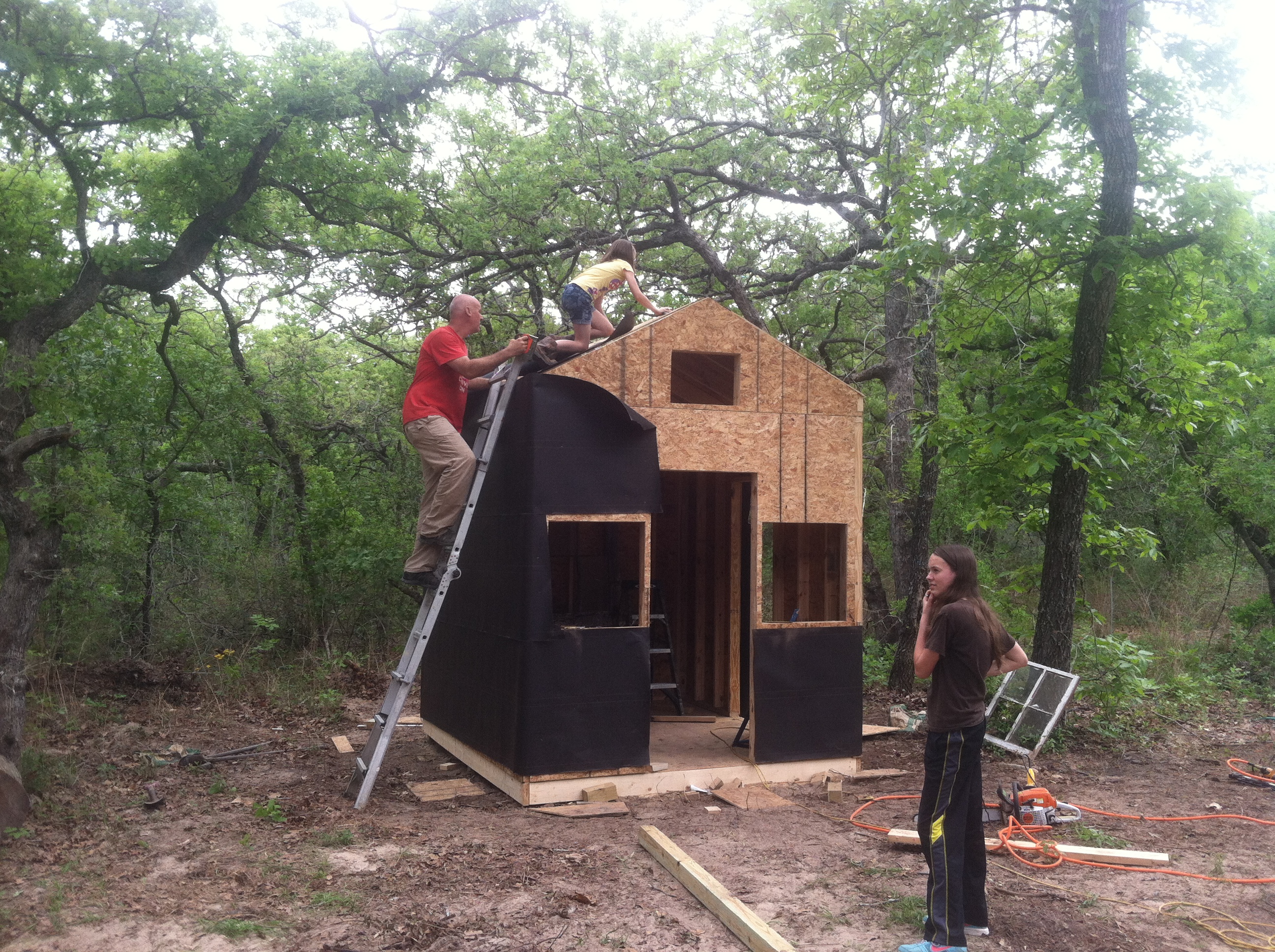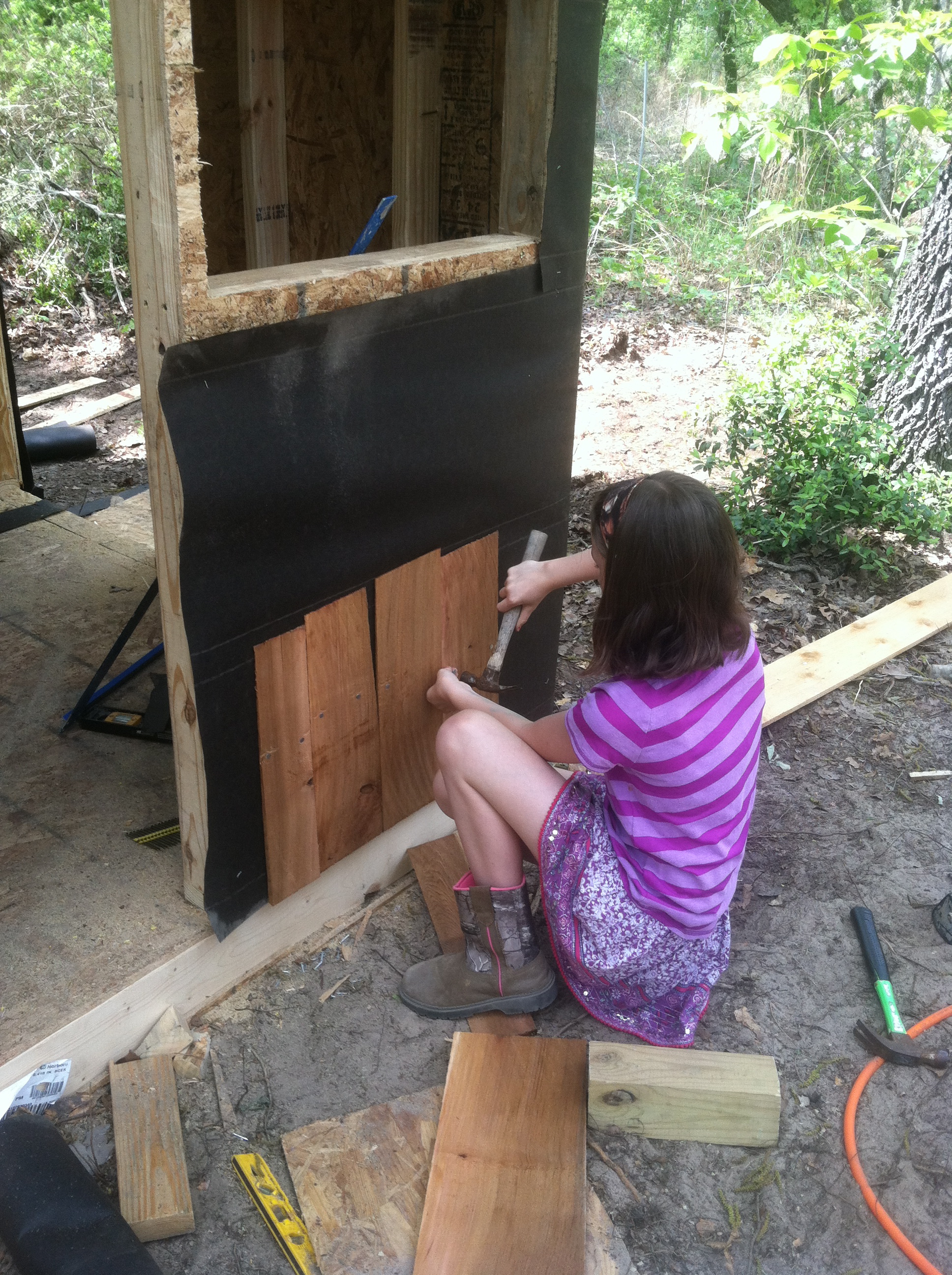 Step 6… Time for ME to shingle the whole thing. Reese, of course, wanted to help. My little construction worker.