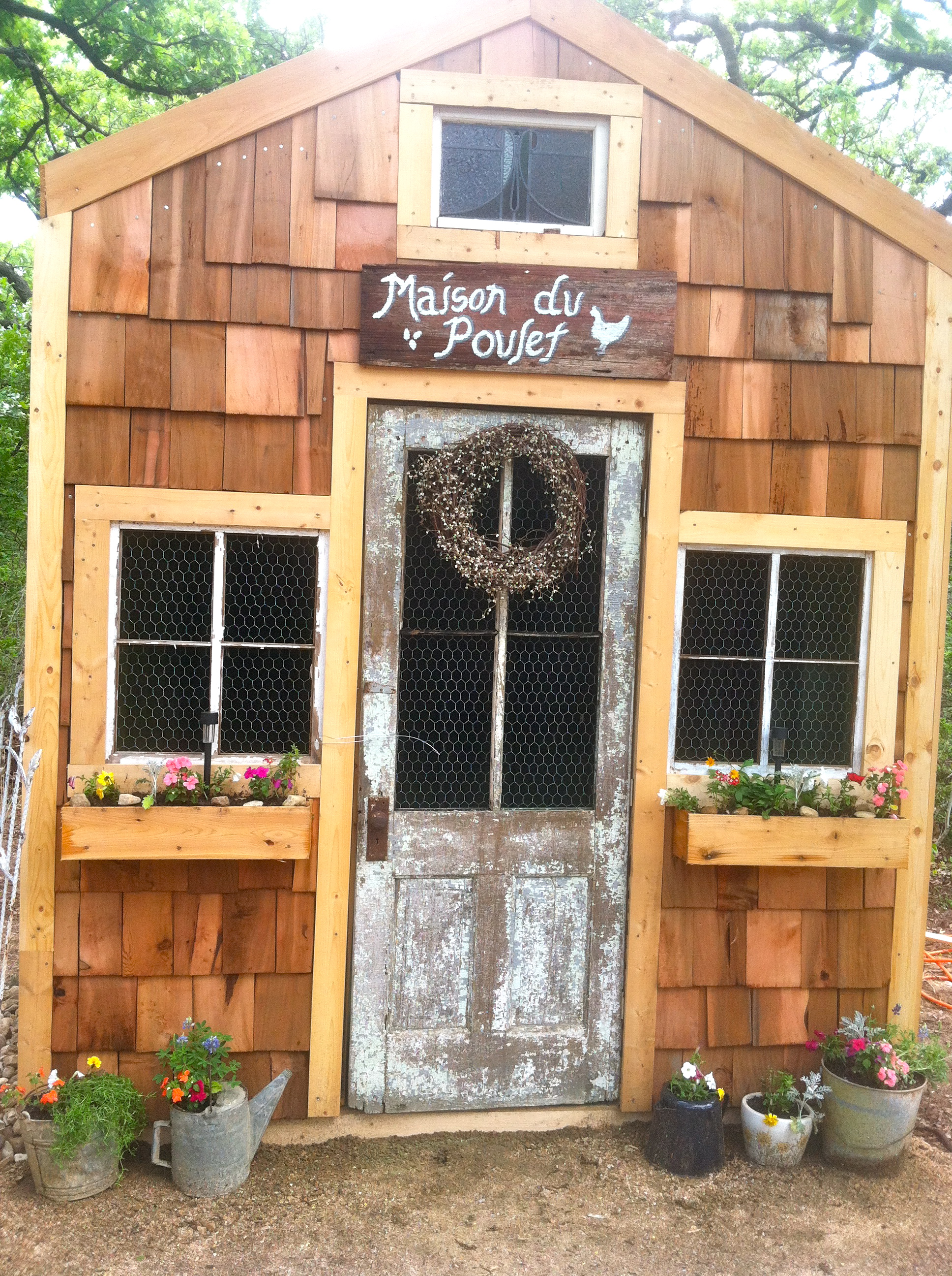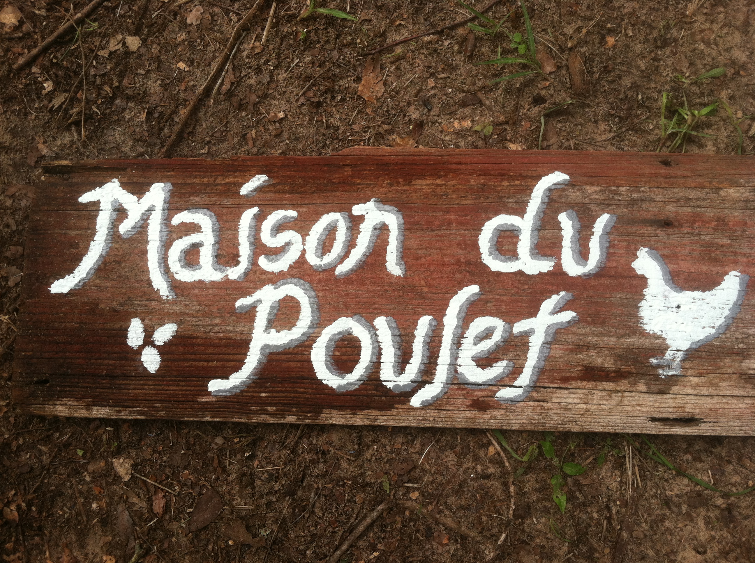 Step 7….personalize it a bit. Birdie-girlies need flowers. And, I painted a sign: “House of Chicken.” (Of course, my French and Canadian reading audience can read it without translation.)