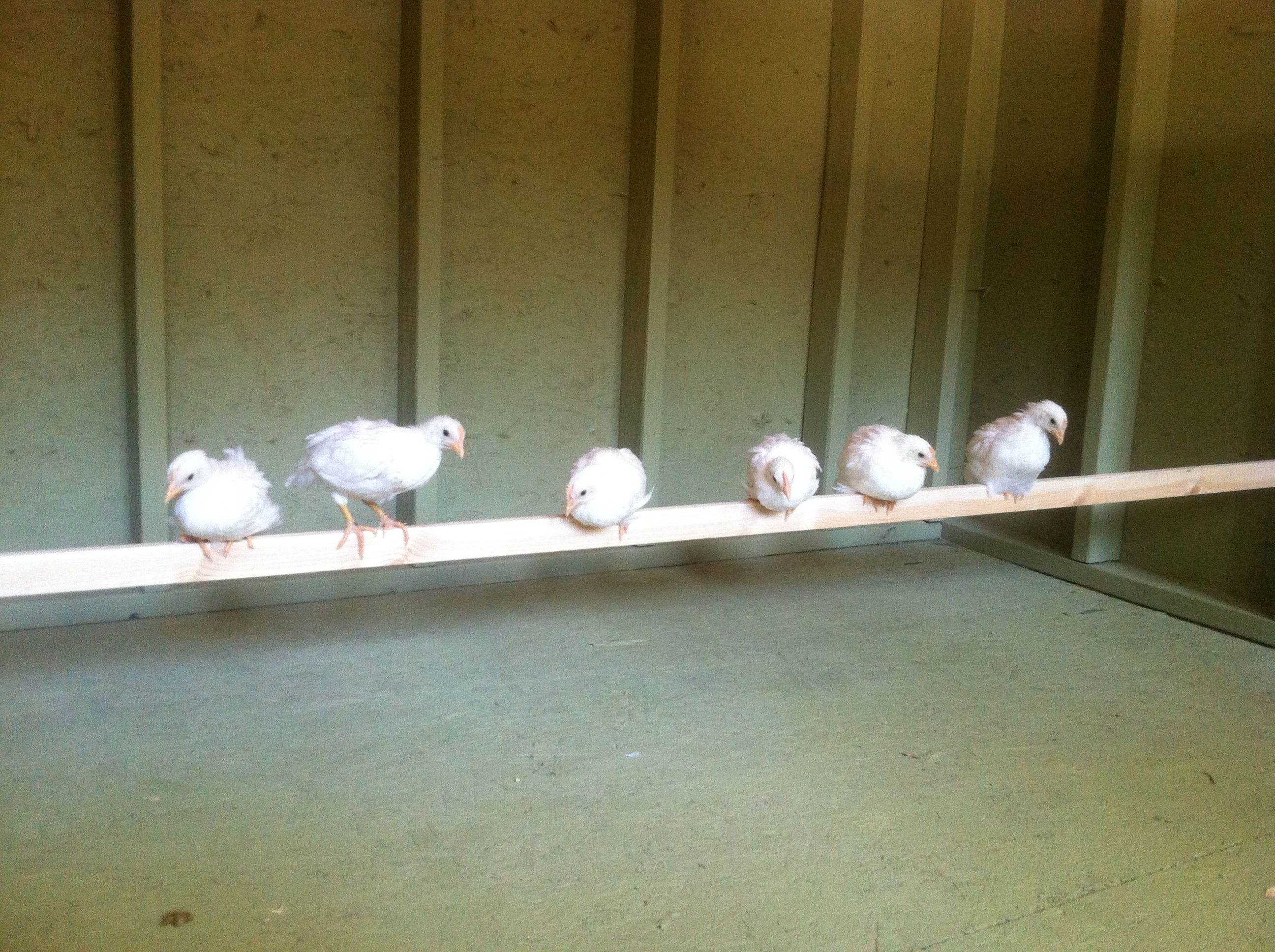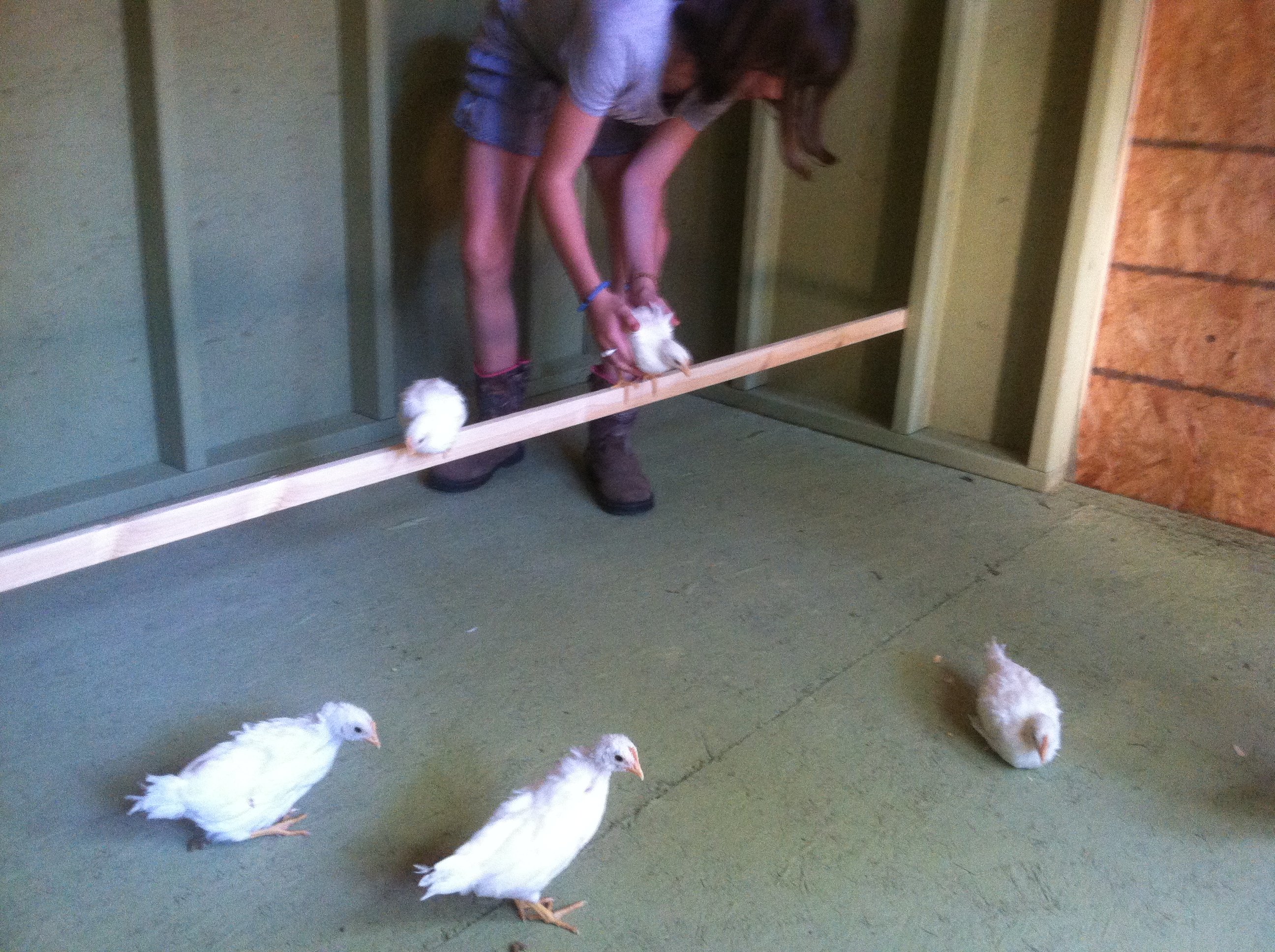 Reese had to teach them where their temporary “roost” is (I never knew a roost was just a perch.)  When they get a bit bigger, we’ll build a droppings table under a higher-up roost.  We were advised to not put anything on the coop floor, but to paint it with semi-gloss paint so it can be washed down or swept out every day, easily.  Faster cleanup.  We just put a quick coat of paint on before Steve left, and sealed up their outdoor run door until he gets back.  Then we’ll spray more paint, build official roost, and nesting boxes.  But for now?  They’re happy…