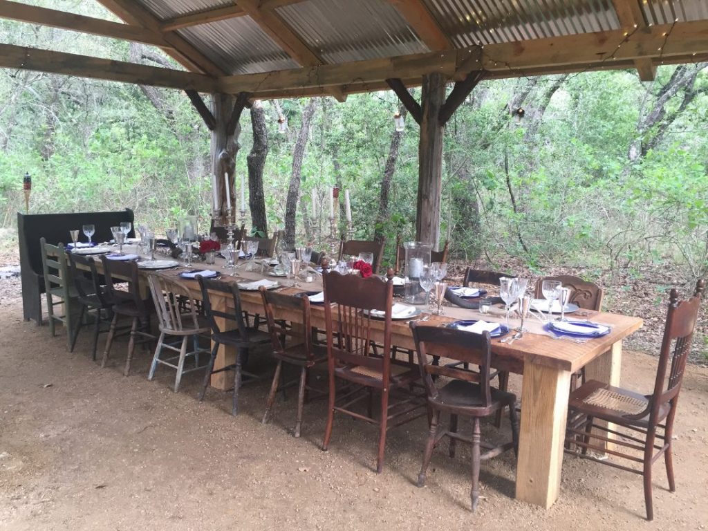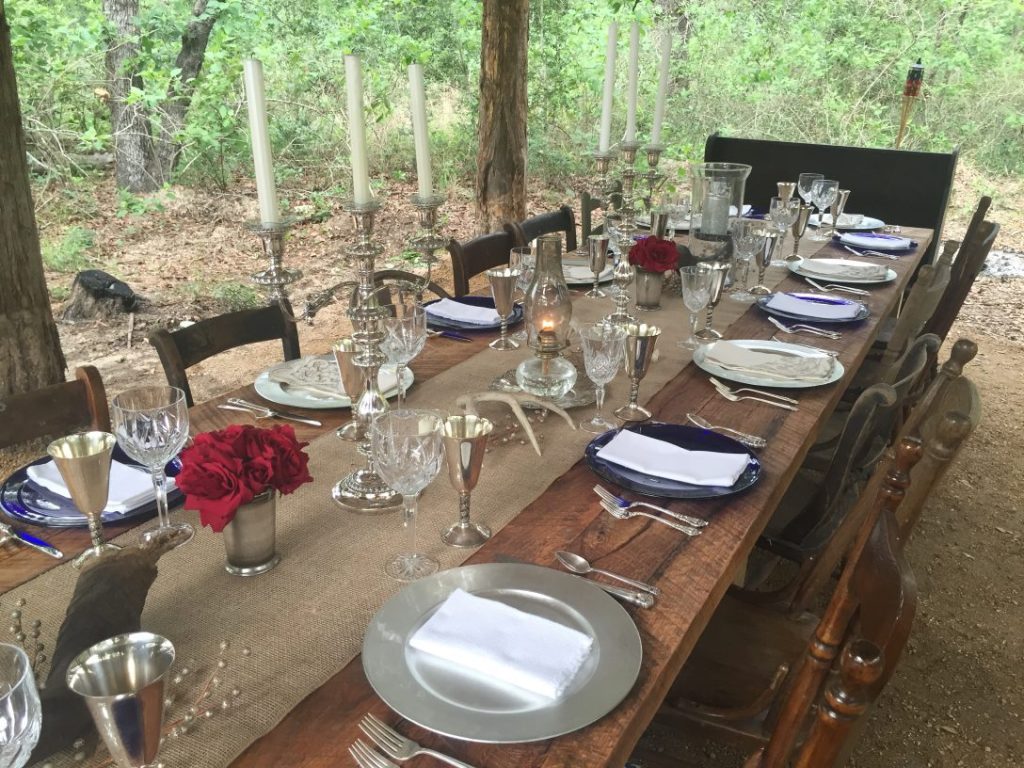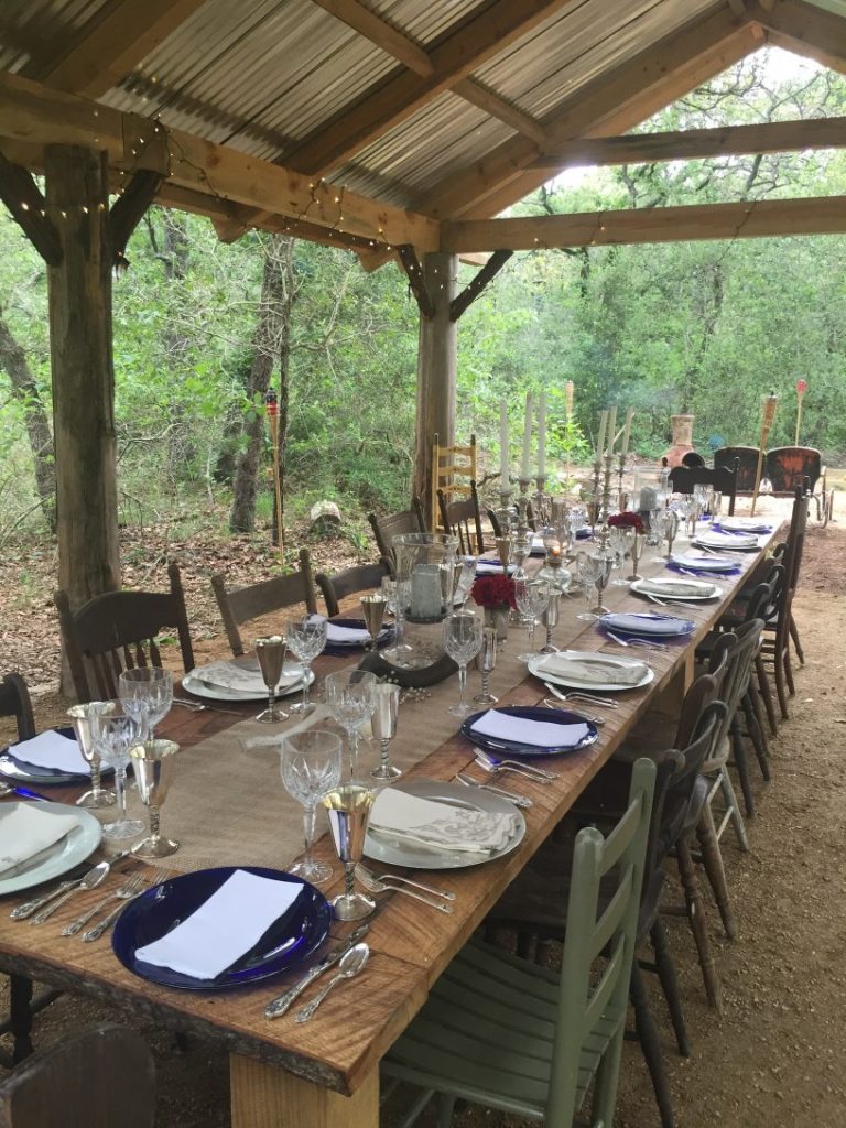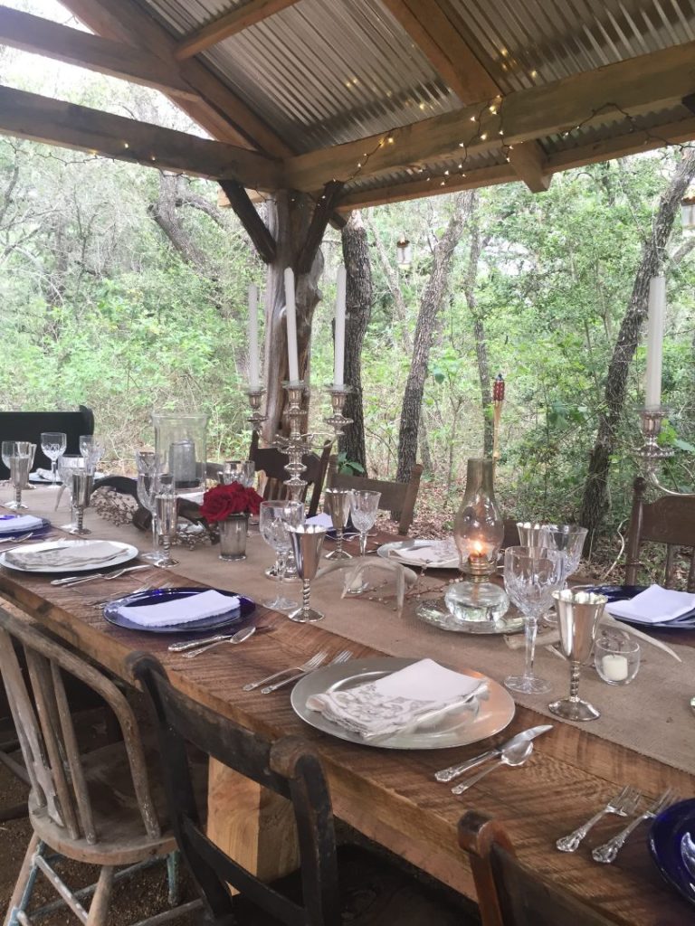 Once we got home, we finished our building project a couple days before the event.  Drawing from the candlelit dinners and chef/plating shows that we watched in California, and Downton Abbey (I told you I’m obsessed), the table was set with silver and antlers…an attempt at “elegant/masculine”.  French music was playing in the background.  We even had enough time to build a Bocci ball court, which they played while waiting to be seated.  (Corn Hole will be out there soon.)  I’m so proud of Steve for the job he did on the pavilion and table.