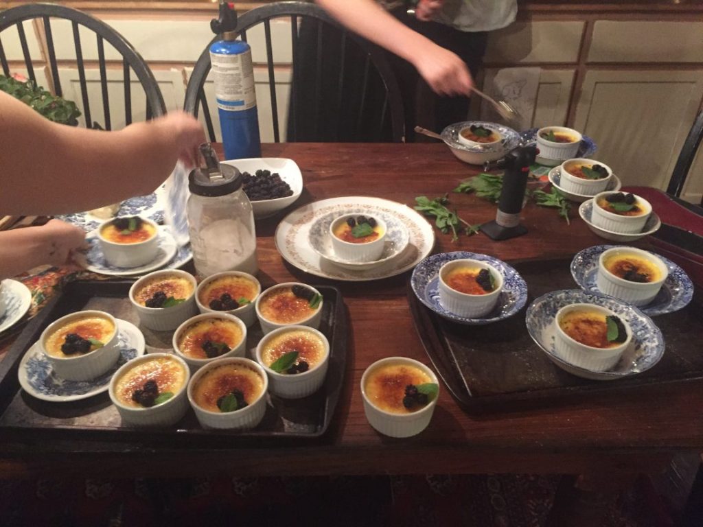 We served cured and smoked duck bacon pizza, and marinated/grilled quail for the 1st course.  Borrowing from our Downton-Dickens dinner (another post on our blog), we made Princess Diana’s salad for 2nd course, Curry-scented butternut squash and potato soup for 3rd course, the poached salmon with mouseline sauce from the Titanic for the 4th course, pork tenderloin with a cider reduction, apple slaw with fennel and cumin, and horseradish potatoes for 5th.  Dessert was creme brûlée with orange liquor and vanilla.  I wish that I had taken pictures of the finished plates, but we were all rushing with the plating, to get the food out while still hot.  I did manage to get a few of the girls plating dessert.