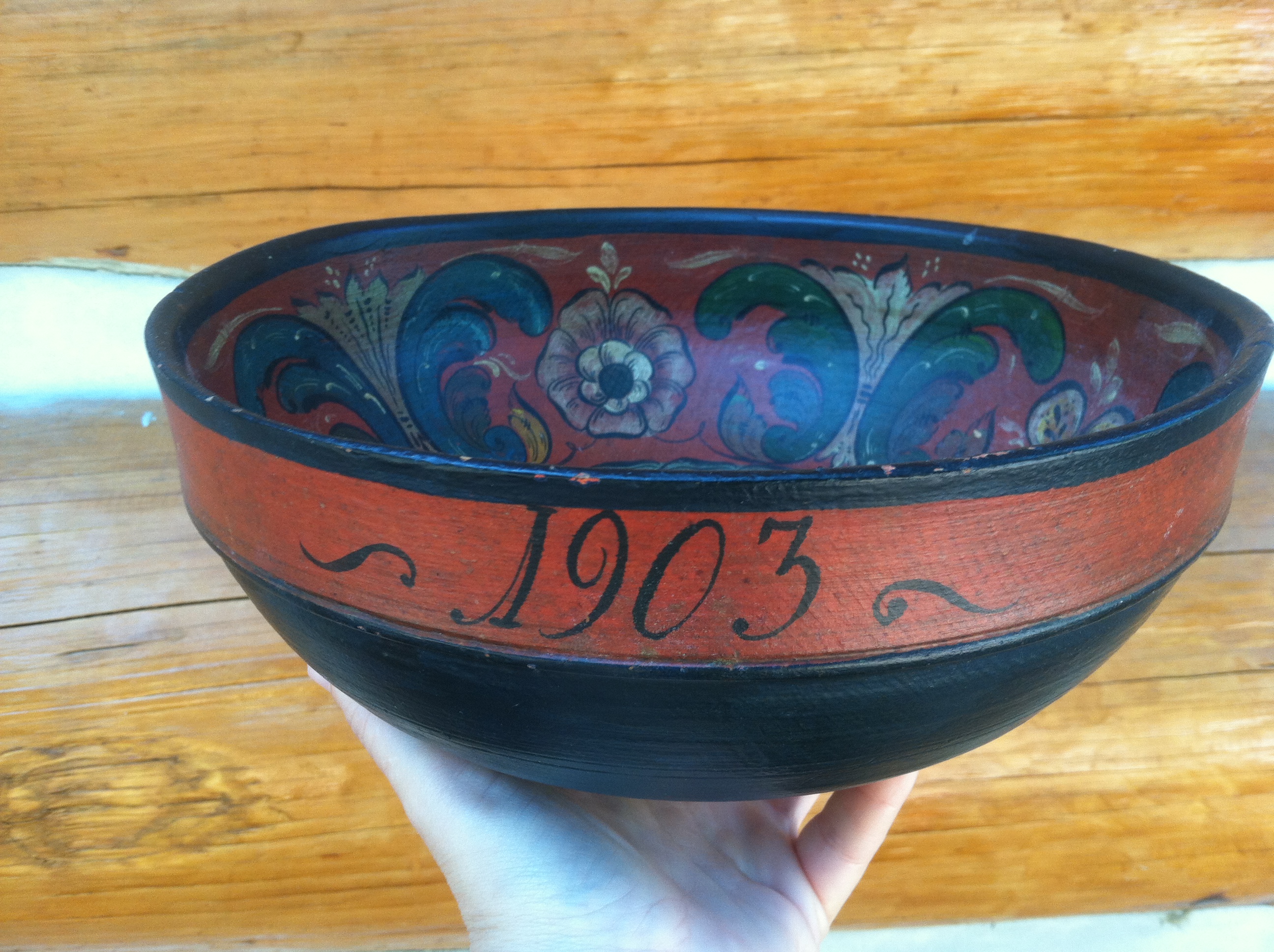 Anne painted the bowl with a technique called “Rosemaling” that came from Norway. She then taught her daughter (my great-grandmother) Marie…who then taught her daughter (Florence), my grandma.