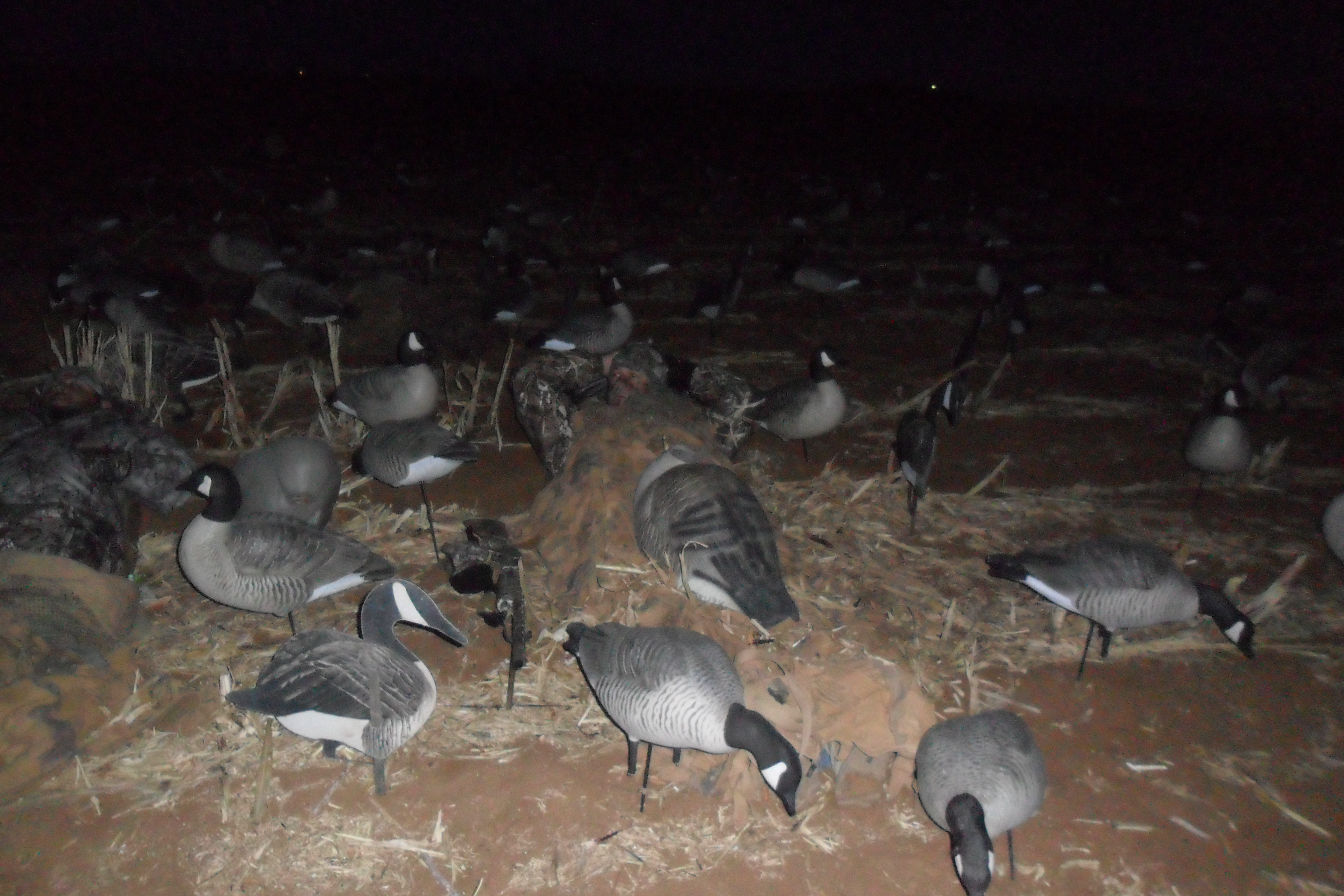 After placing the 144th goose decoy into the ground (I kid you not), I was able to step back and take a panning view of what we had accomplished. It was fascinating! There was literally a sea of bobbing fake birds everywhere, that couldn’t have looked more real. I wasn’t a goose, but they would have fooled me! (this picture was taken after the hunt, in the daylight)…